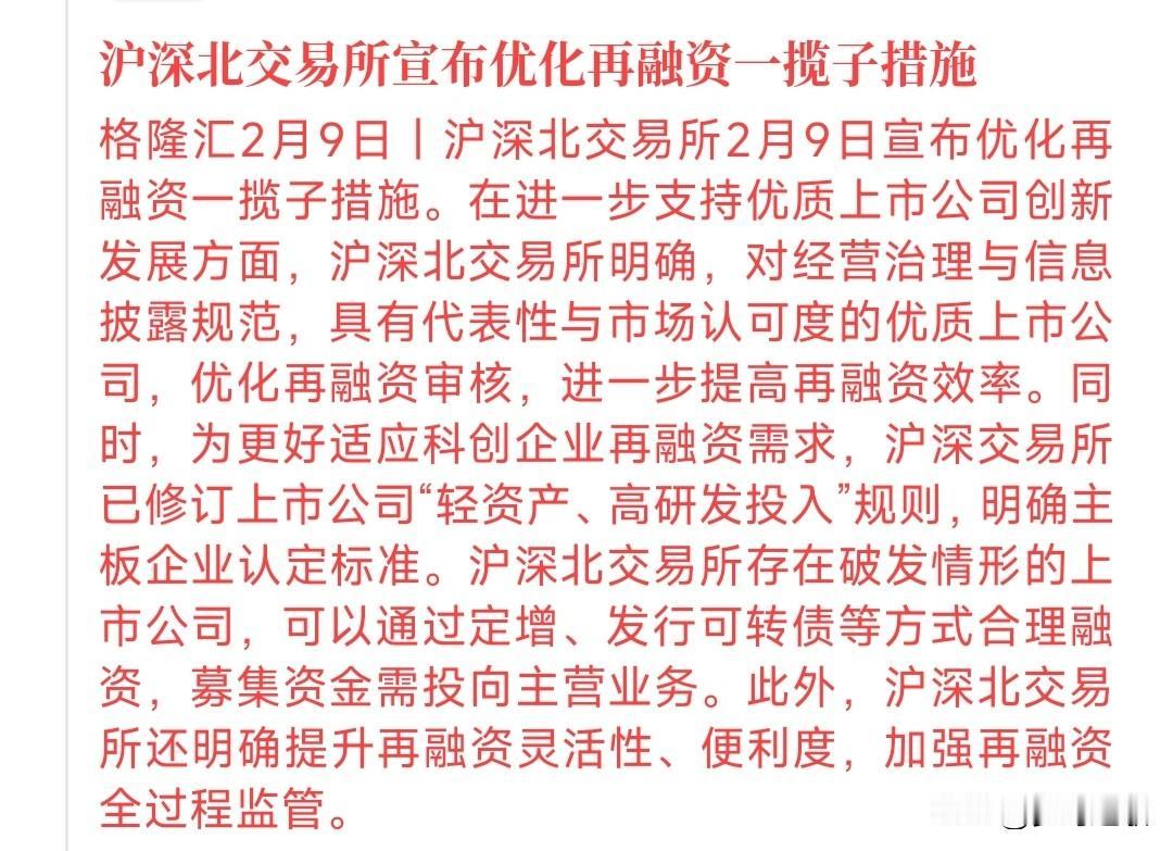 沪深北交易所新规出台 从公告上看,主要的就是4点 1.优质规范的上市公司,再融资审核更快、效率更高; 2. 主板也明确了轻资产、高研发企业的认定标准,更适配科创类公司的融资需求; 3. 哪怕股票破发的公司,也能正常定增/发可转债拿钱,但钱必须全投主营业务,不能乱花; 4. 整体让再融资更灵活方便,同时全程监管会更严,防止违规。 说白了就是给公司融资开绿灯,让更多的公司拿到钱发展下去,同时这些融资的钱也控制了风险,把钱要投在主营业务上,不会让融资来的钱乱花。