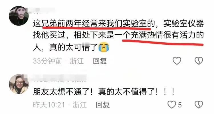 来自杭州的王某威先生,因为销售生意不好做,再加上女朋友出轨,他竟然选择了轻生。他之前还是健身达人,无论身材和相貌都很不错。就是太想不开了。他的朋友为他惋惜,在2月8号发了一段文字纪念他。引发了网友们的感慨太想不通了,太不值得了。朋友都说他性格很好,对生活充满热情。生活难免有挫折,咬咬牙挺一挺就过去了,天无绝人之路何必自己自寻绝路呢!