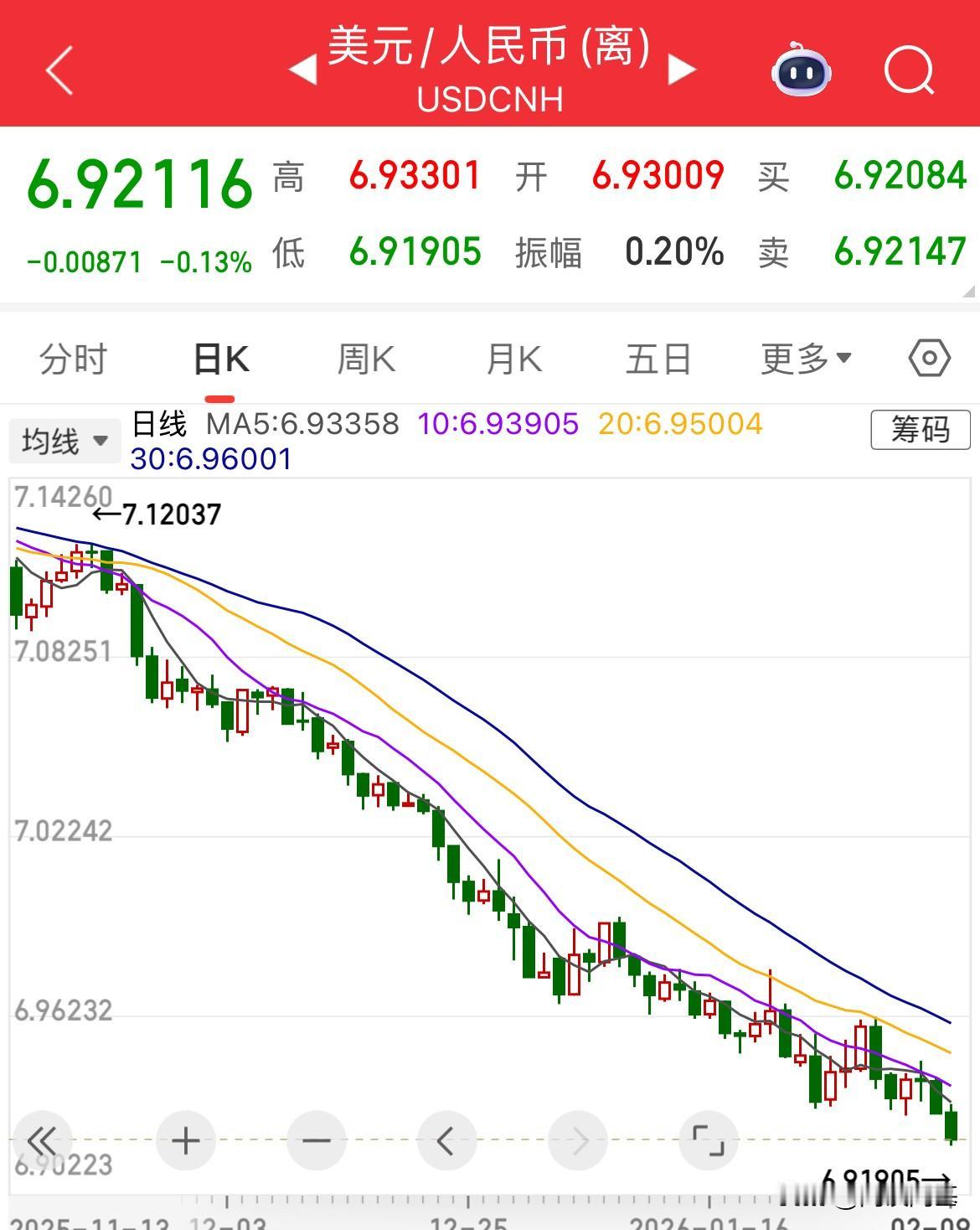 人民币走高,突破6.92,创2023年5月以来新高,这波下来从高点7.26917一路突破冲过7的重要心理关口,一路突破至6.91905,美元震荡走低跌幅0.40%,高点110下来,累计跌幅超10%了 美联储降息预期升温,美元指数持续下行,非美货币普遍升值,中国经济韧性强,2025年贸易顺差已经超1万亿美元, 人民币升值进口成本下降,(原油、大宗商品、海外消费),吸引外资流入,但出口为主的话,短期出口企业价格竞争力下降。