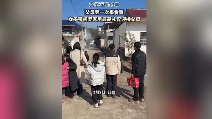 暖哭!2月8日,江西一院子里的鞭炮声,听着格外让人心里发热。 河南女子远嫁江西13年,这是父母头一回上门看她。男方家早早就备好了鞭炮,老人刚到,噼里啪啦的声响就炸了开来,热热闹闹的,像在欢迎最珍贵的客人。 网友都看在眼里:“这鞭炮放得有讲究,是真把岳父母当回事儿。”13年的等待,终于盼来亲人团聚,桌上的家常菜冒着热气,老人拉着女儿的手有说不完的话,这场景,比啥都动人。 远嫁的姑娘都懂,回趟娘家不容易,父母千里迢迢来看闺女,这份牵挂藏了13年。而男方的这份重视,不光是给岳父母的体面,更是给妻子的安心。 你身边有远嫁的故事吗?第一次带父母见婆家是啥样?评论区聊聊这份跨越千里的亲情,为这家人点个赞,转发让更多人感受这份温暖~ 女子远嫁13年 父母第一次上门看女儿