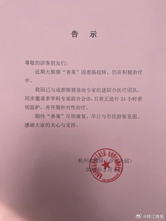 【#大熊猫香果患肠扭转正接受治疗#,这种肠道疾病是大熊猫的常见病】2月9日,杭州动物园发布告示:近期大熊猫“香果”因患肠扭转,目前正在积极治疗中。杭州动物园已与成都熊猫基地专家组建联合治疗团队,同步邀请多学科专家联合会诊,目前正进行24小时密切监护,并开展针对性治疗。期待“香果”尽快康复,早日与市民游客见面。肠扭转是什么病症?据《解放日报》报道,2016年,上海野生动物园大熊猫幼仔“花生”曾患“严重肠扭转并导致大面积肠坏死”;2010年7月,北京动物园饲养的一只3岁龄亚成体的雌性大熊猫曾突发急症,最终发现是“小肠扭转及肠系膜扭转”。报道称,这种肠道疾病是大熊猫的常见病。大熊猫主要以容易消化的动物性食物为食,其消化器官和消化酶至今仍保留着肉食性动物的特点,比如消化道短、无盲肠、食物通过消化道时间短,且消化纤维素的酶和细菌微生物少等。大熊猫消化系统疾病主要包括胃肠炎、胃肠出血、肠扭转、肠套叠、溶血性贫血衰竭、胰腺炎、蛔虫病等。(潮新闻 记者 叶怡霖)