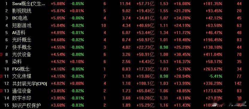 今日A股市场迎来全面拉升,上证指数高开高走,盘中涨幅一度超50点,最终收出阳线,不仅站稳4100点整数关口,更成功收复20日均线,为市场注入强劲信心。从热点表现来看,文生视频、影视院线、短剧游戏、BC电池、AI语料、光纤概念、光伏设备、快手概念、F5G概念、染料、共封装光学、通信设备等板块涨幅居前,其中文生视频与影视院线板块大涨6%,成为当日盘面的领涨先锋。
