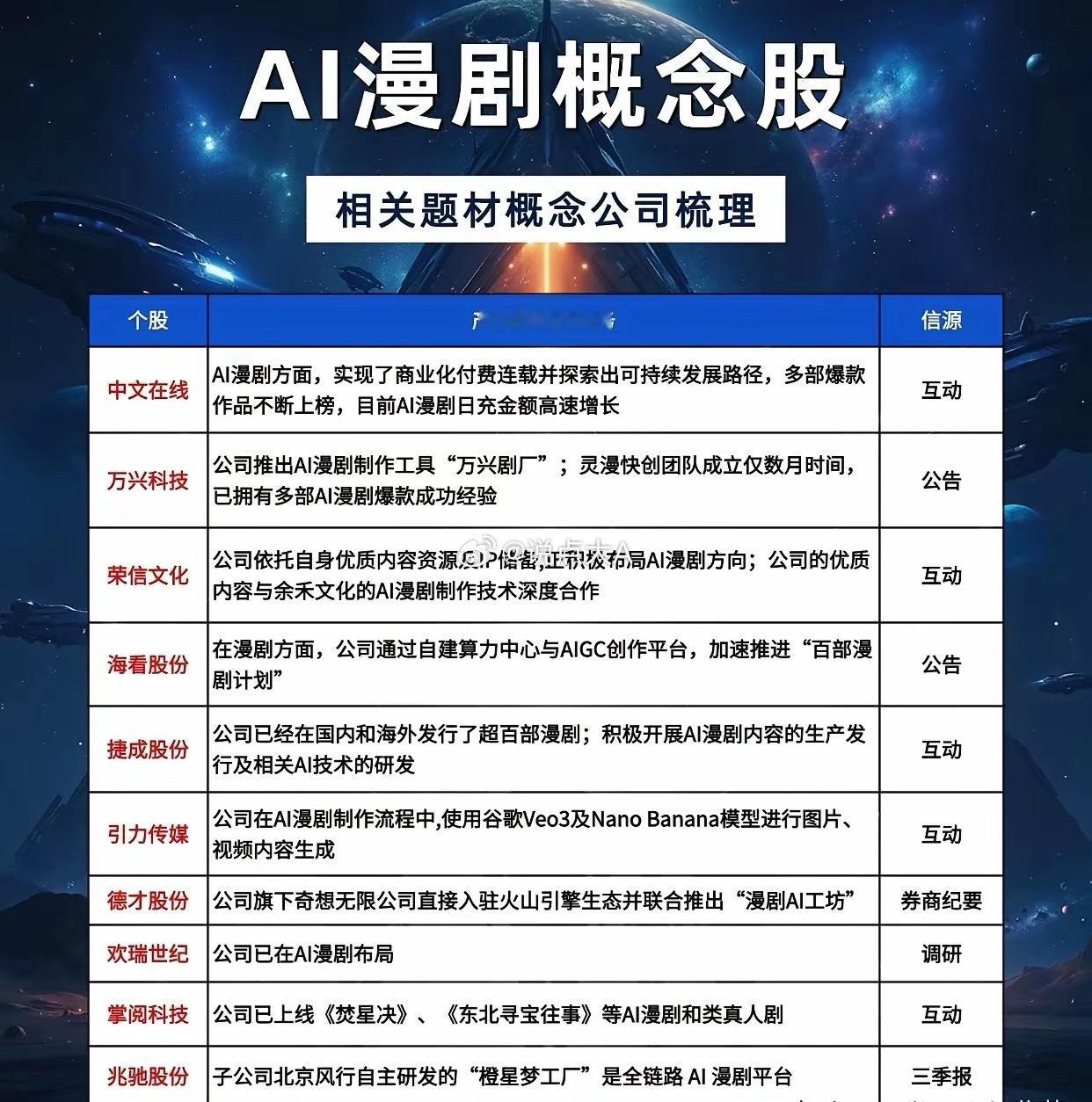 AI漫剧:从爆款赛道到资本新宠,产业链图谱全解析AI漫剧正以“AI+短剧+动漫”的三重叠加效应,成为资本市场的新风口。这一赛道的核心逻辑在于,通过AIGC技术重构内容生产范式,解决传统短剧制作周期长、成本高、IP储备不足的痛点,同时借助短视频平台的流量红利实现快速破圈。从产业链来看,上游是技术与工具层,万兴科技的“万兴剧厂”、引力传媒使用的谷歌Veo3模型、德才股份的“漫剧AI工坊”等,为内容生产提供了高效工具;中游是内容制作与IP层,中文在线实现了AI漫剧商业化付费连载,多部爆款作品持续上榜,荣信文化则依托自身优质IP储备,与余禾文化深度合作;下游是分发与变现层,海看股份通过自建算力中心与AIGC创作平台,加速推进“百部漫剧计划”,而昆仑万维的短剧平台DramaWave已上线动漫频道,构建了完整的分发生态。案例方面,中文在线的AI漫剧日充金额高速增长,验证了商业化路径的可行性;万兴科技的灵漫快创团队成立数月便打造出多部爆款,凸显了AI工具的赋能效率。随着技术迭代与内容供给的丰富,AI漫剧有望从“流量型”赛道升级为“价值型”赛道,吸引更多资本与玩家入局。