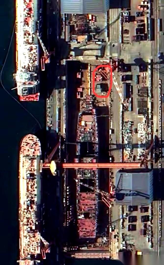 看到最前头那块白色的墩子了没? 对,就那儿。 那才是看懂咱们“四公主”真实身板儿的钥匙。 一堆人拿着放大镜算,说船坞里这排墩子总长337米,那船肯定就这么长。 嗨,我跟你说,这么看就外行了。 那个最靠前的白墩子,是给水底下那个圆滚滚的“大鼻子”(球鼻艏)留的位置。那是用来破浪的,不算在水线长度里。 把这十来米去掉,你再品。 啥意思? 意思就是,咱们这宝贝疙瘩,水线长度极大概率在327米左右。 你再仔细瞅瞅,船头船尾都还没焊满呢,后面还有大块的“积木”等着往上码。 即便这样,327米,也已经是这个星球上,常规动力航母里水线最长的一艘了。 没有之一。 这玩意儿,它不只是一堆钢铁。 它是一口气,一种“我不说话,但我往这一站,你就得掂量掂量”的绝对底气。 咱就踏踏实实搬个小板凳等着吧。 看它一点点成型,下水,劈开海浪。 这种看着自家“孩子”一天天长壮实的感觉,真他娘的踏实。