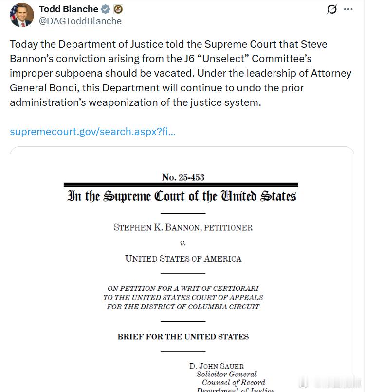 今天,美国司法部向最高法院表示,史蒂夫·班侬因1月6日“非选委员会”不当传票而被定罪的判决应当被撤销。在司法部长邦迪的领导下,本部门将继续纠正前任政府对司F系统的武器化滥用。