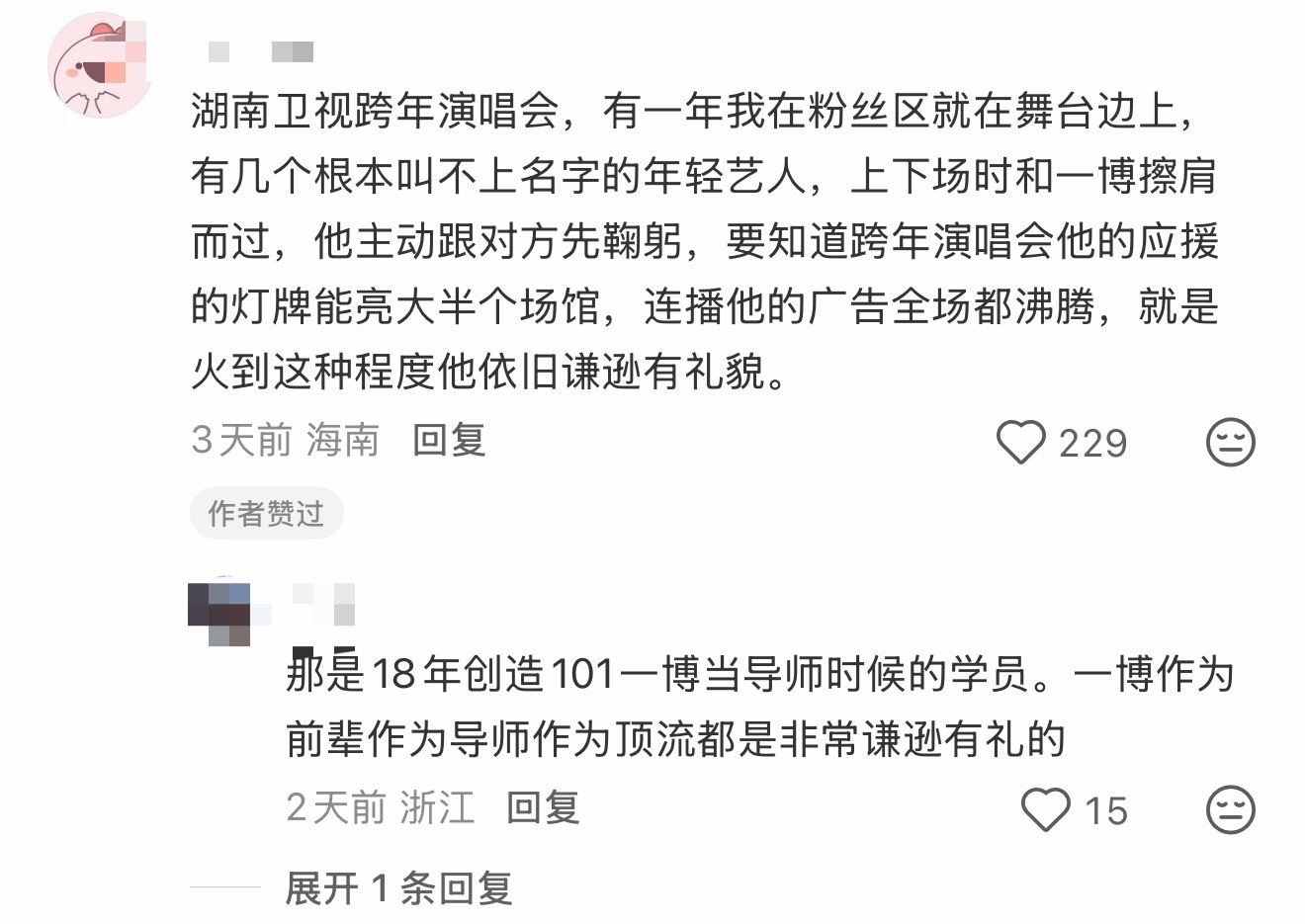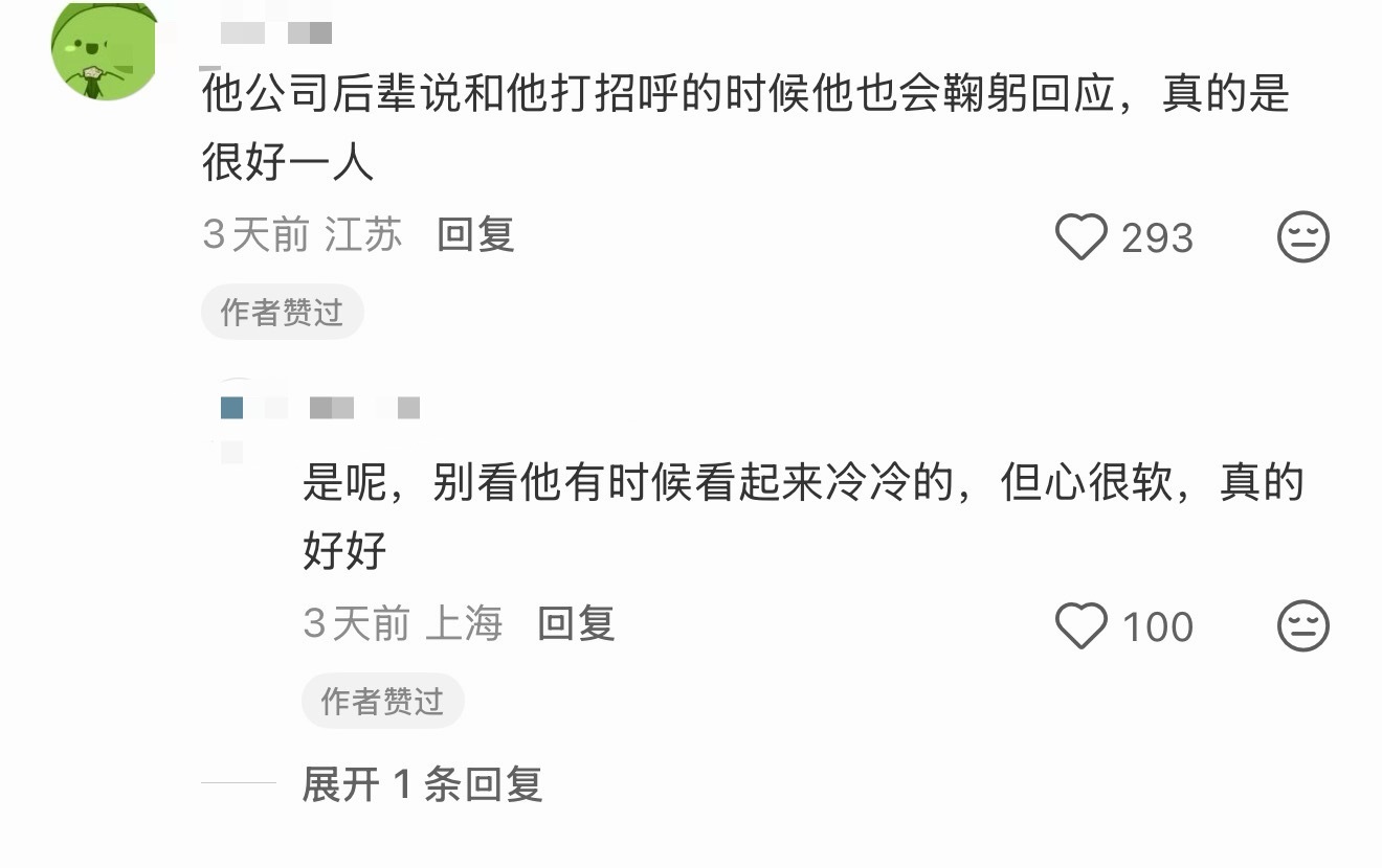 刷到一个别家粉说看到王一博都这么红了还给主持人问候鞠躬很有礼貌,评论说王一博就是这样的,对所有努力的工作人员都释放善意和尊重,无关乎咖位,用冷冷的脸做着最温柔的事,谁不爱这种反转魅力。