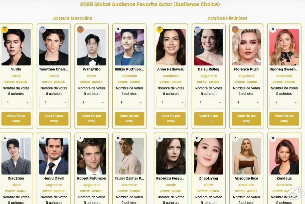 恭喜肖战、王一博两人都获得了2025年欧洲世界电影节,全球观众最喜爱中国男演员,肖战第5名,王一博第三名。据说这个奖对标国内的百花奖,含金量不低,由全球观众付费投票选出!。 女演员国内只有赵丽颖获得,第五名。