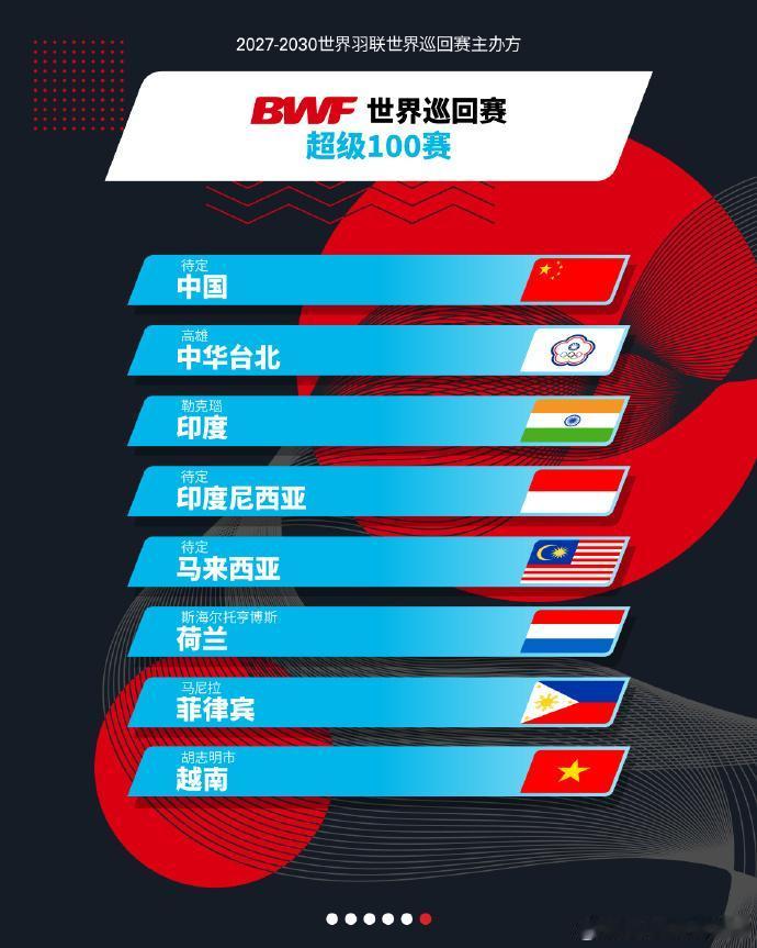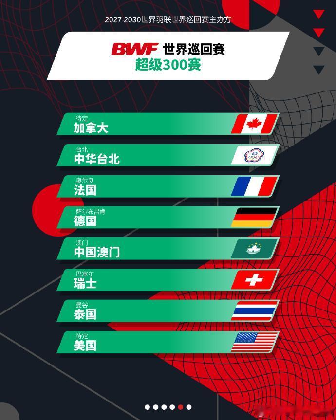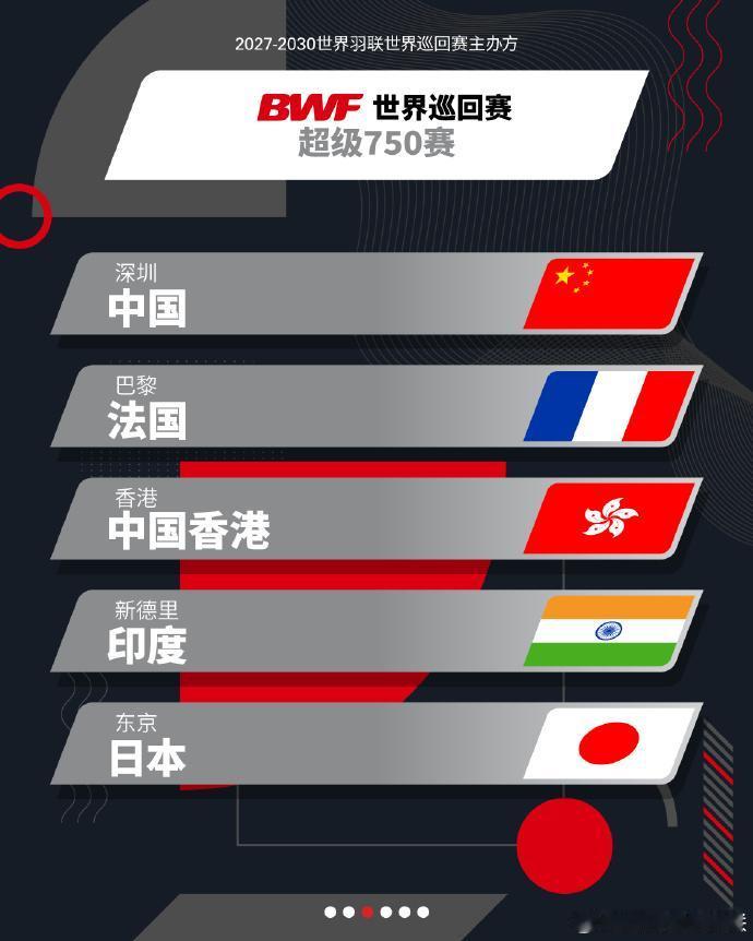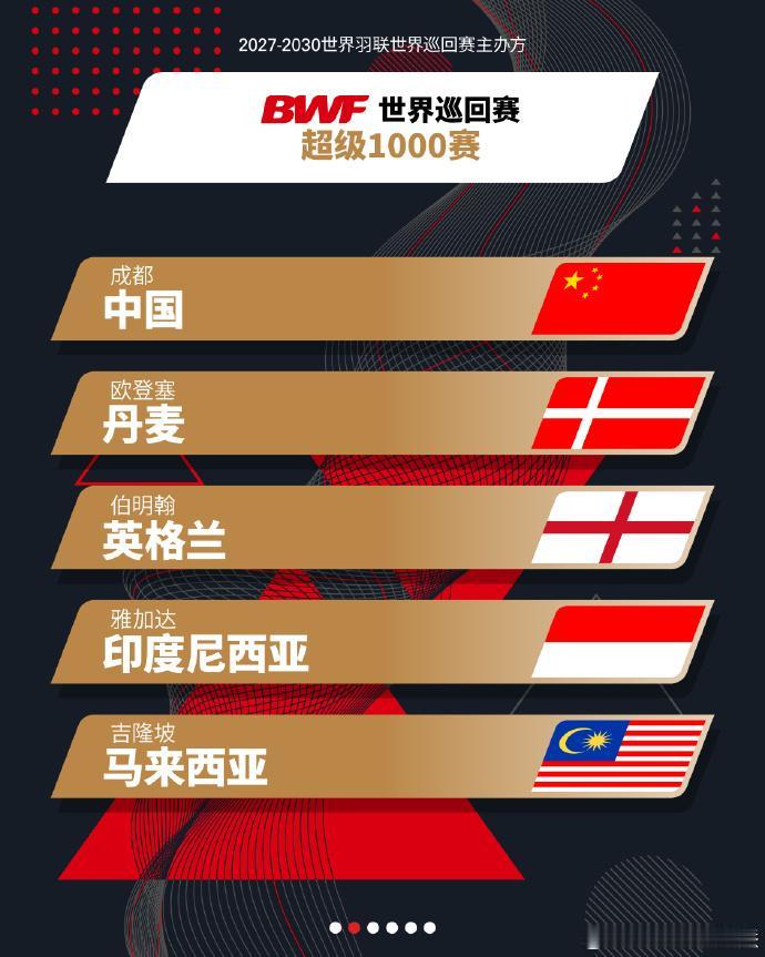羽联大动作,2027-2030全新赛制,奖金也高了 世界羽联现已确认2027年-2030年全面升级后的 BWF 世界巡回赛(共 36 站)的赛事主办方。丹麦公开赛升为1000赛、中国香港公开赛升为750赛、新加坡公开赛降为500赛。 新的巡回赛结构将由统一的六个级别组成: 世界巡回赛总决赛:待定 5站超级1000赛:中国、全英、马来西亚、印尼、丹麦 5站超级750赛:中国、中国香港、法国、印度、日本 9站超级500赛、8站超级300赛、8站超级100赛(其余待定) 其余主要升级: 1、各级别电视转播比赛数量增长100% 2、各级别奖金均有所提高: S1000:200万美元(2026年为145万美元) S750:110万美元(高于之前的95万美元) S500:56万美元(高于之前的50万美元) S300:29万美元(原来为25万美元) S100:14万美元(高于之前的12万美元) 从2027年起,五站超级1000赛的新升级 单打项目:48名球员参赛,小组赛+淘汰赛的新赛制 双打项目:32对组合的单淘汰赛制 每站赛事将持续11天,横跨两个周末,1095场比赛都将实现全球电视转播 赛事总奖金提升至200万美元 世锦赛将采用小组赛加淘汰赛的赛制 从 2027 年起,苏迪曼杯以及汤姆斯杯和尤伯杯将扩充参赛队伍,且时间改为12天