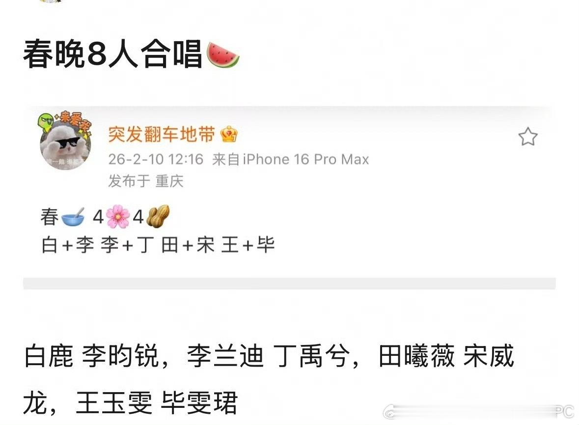 2026春晚8人合唱节目白鹿➕李昀锐、李兰迪➕ 丁禹兮、田曦薇➕ 宋威龙、毕雯珺➕王玉雯