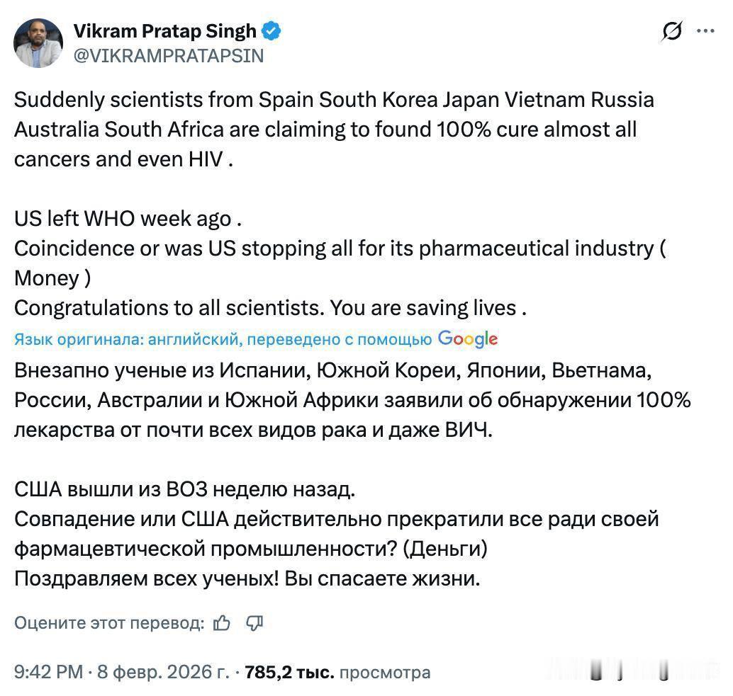 一种新的阴谋论正在推特上迅速传播。 据说,美国退出世卫组织后,世界各地立刻出现了“各种癌症甚至艾滋病的治疗方法”。 西班牙、韩国、中国、墨西哥、越南、俄罗斯、古巴、南非、日本和澳大利亚等国纷纷报道了新药的发现。一些国家宣布研发出疫苗或药物,声称可以彻底治愈各种癌症。 英语用户不禁质疑,这究竟是巧合,还是美国为了维护制药行业的利益而阻挠了这些药物的研发?