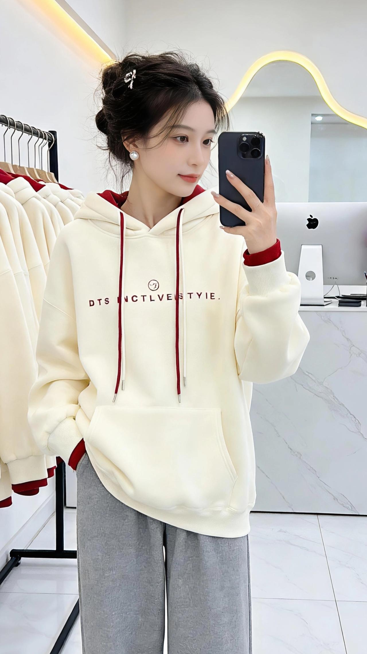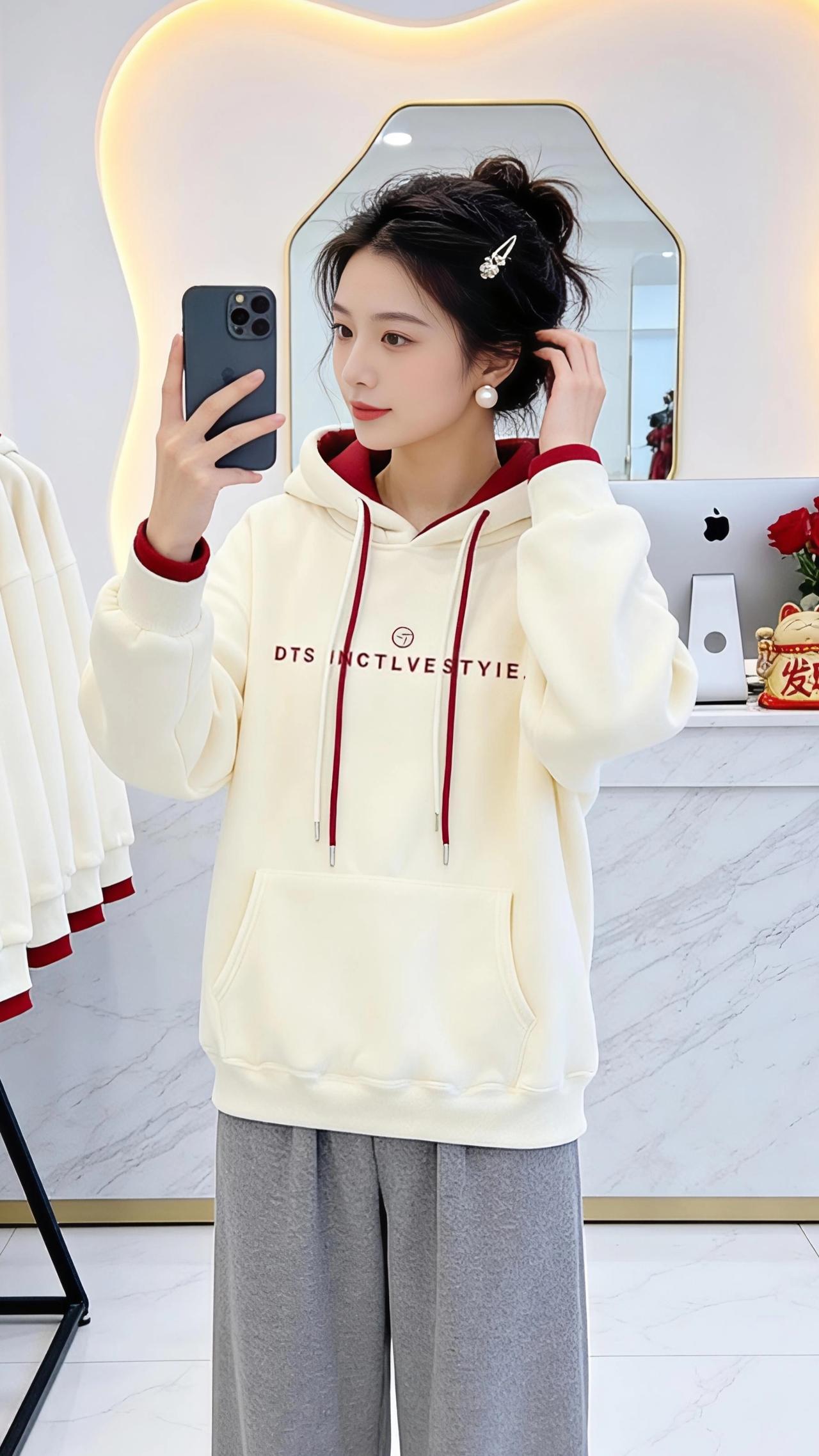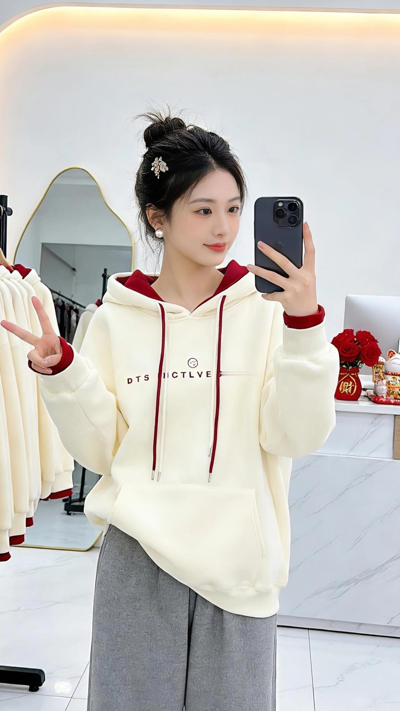 在镜前的方寸天地里,时光被温柔地折叠。 米白与酒红的撞色,像冬日里不期而遇的暖阳,裹着柔软的绒感,漫过肩头,落进衣摆的褶皱里。连帽的轮廓藏着几分随性,抽绳垂落,像未说出口的心事,在风里轻轻晃。 指尖划过手机屏幕,镜头里的自己,发间别着细碎的光,珍珠耳坠在颈侧轻摇。每一次抬眸,都与镜中的自己温柔对视;每一次比出的“V”字,都是对平凡日常的小小加冕。 身后的衣架上,同款衣料静静垂落,像时光的另一种倒影。大理石台面的红玫瑰,在白瓷瓶里燃着热烈的火,与衣摆的红遥相呼应。空气里浮着浅淡的香,是洗衣液的干净,也是心底的安稳。 这不是什么盛大的时刻,只是一个普通的午后,在试衣镜前,与一件卫衣的相遇。它裹着体温,也裹着对生活的细碎期待——期待风来,期待光落,期待下一个转身,就能撞见更好的自己。 高级感穿搭 新年穿搭 冬季穿搭 ,棉衣棉服