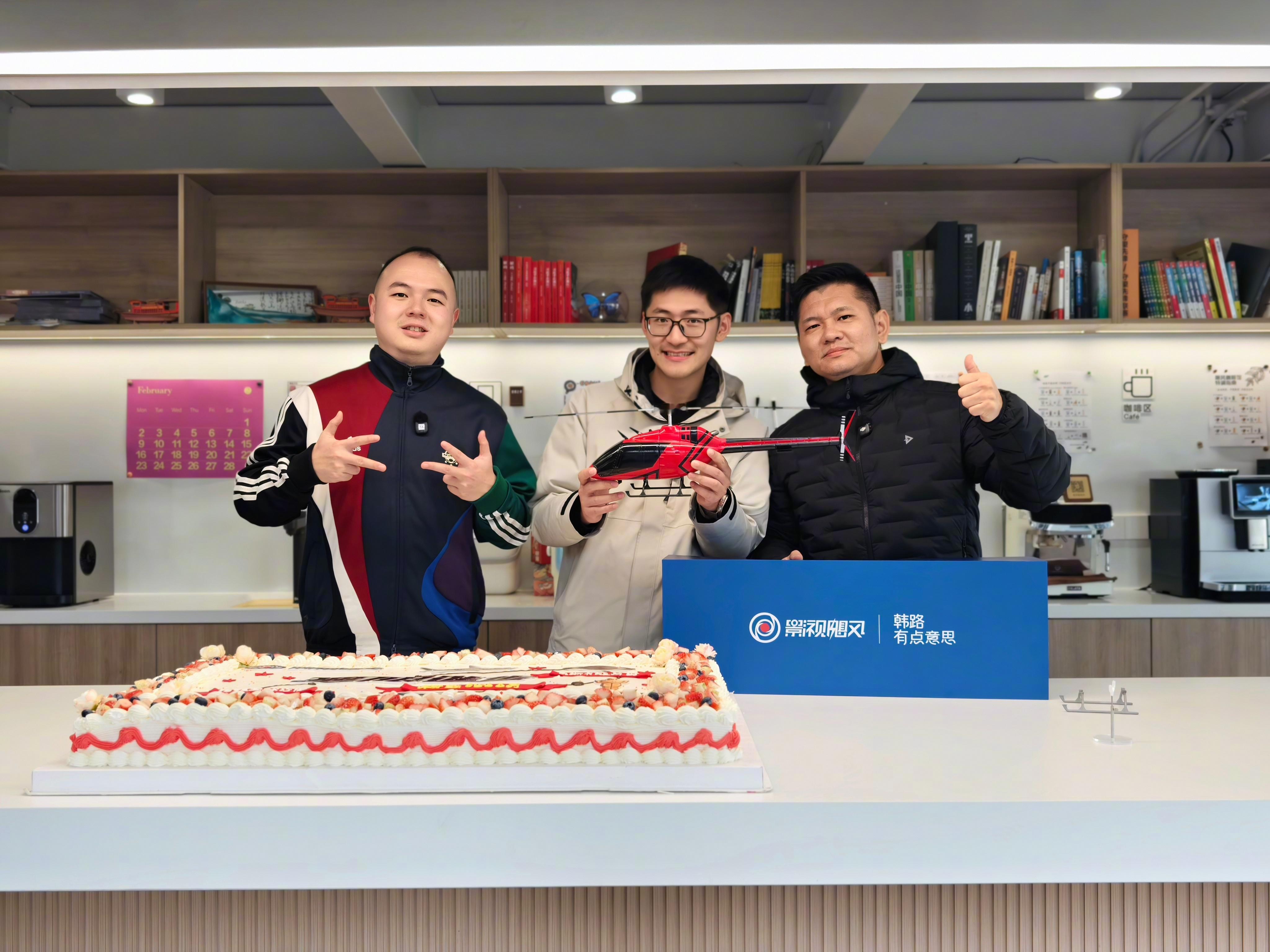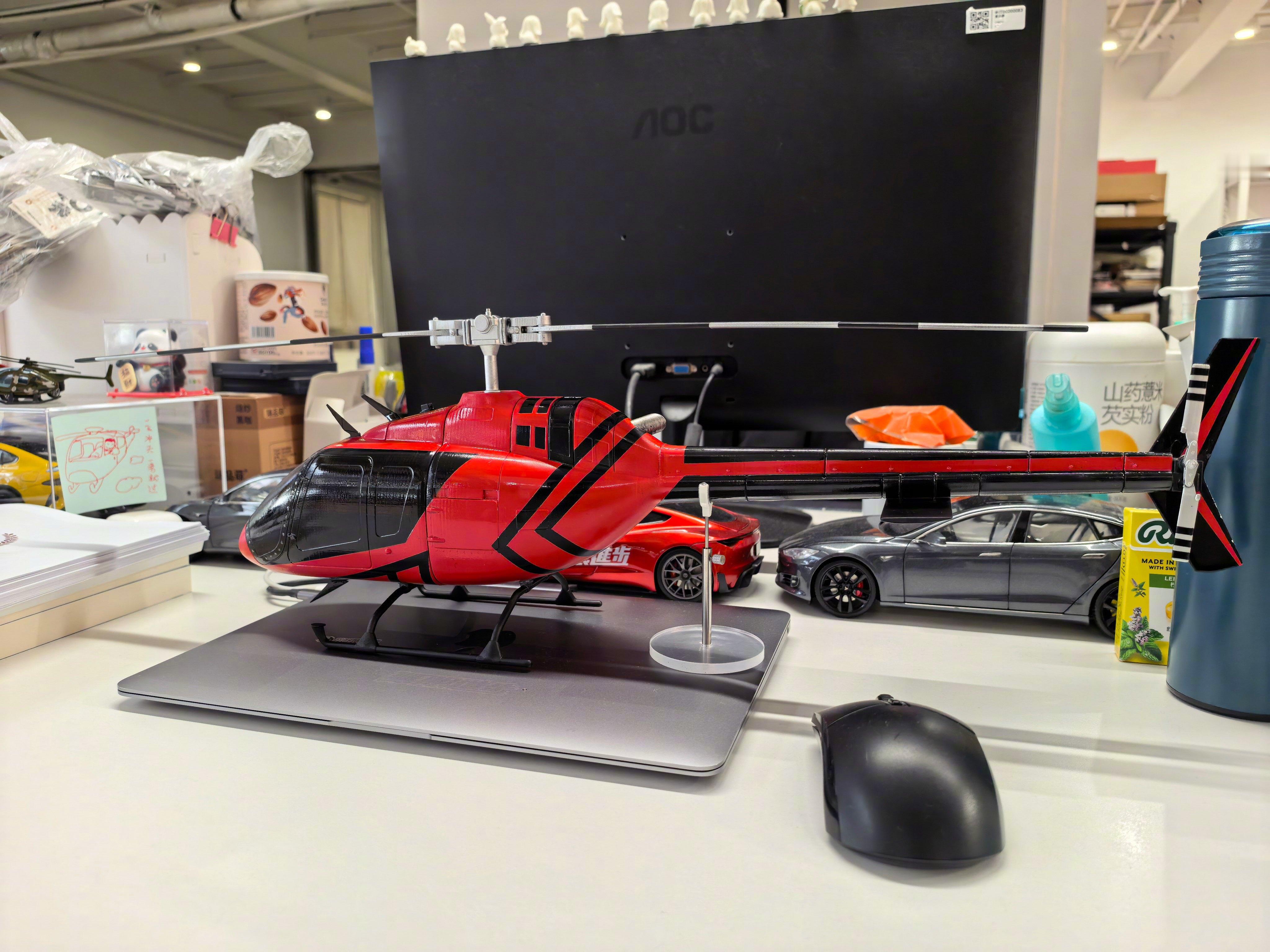 今儿在这聊的很高兴,这次我带了蛋糕、带了Tim最想买的贝尔505直升机(的模型),网上真没卖的,我们自己建模3D打印的。