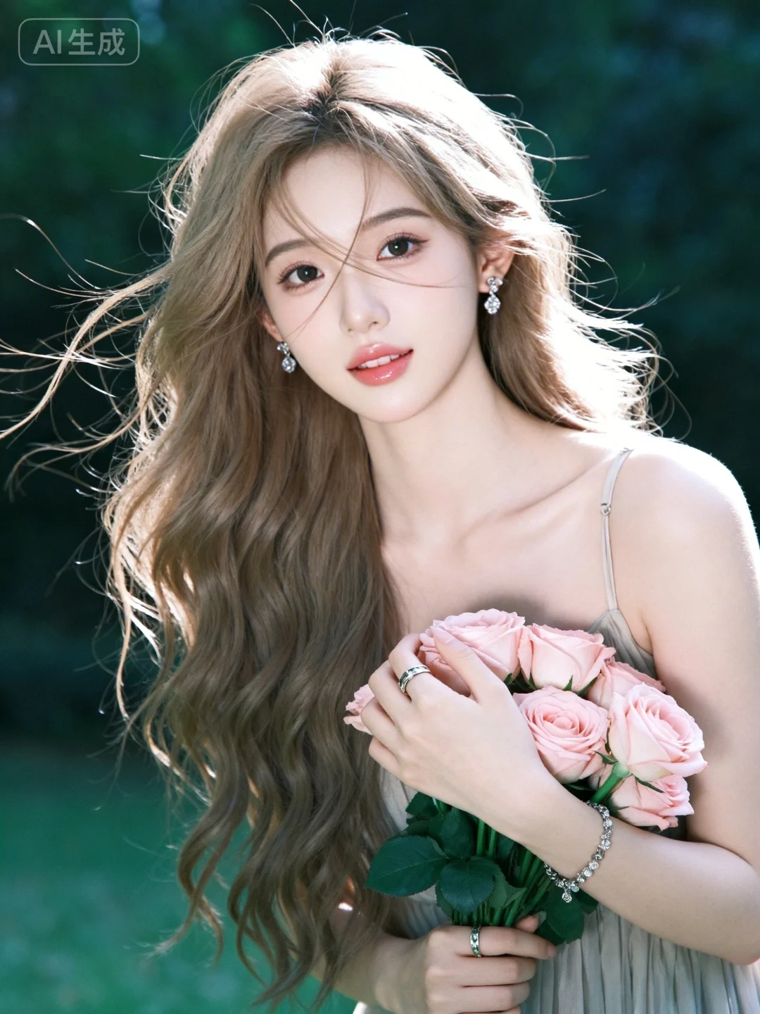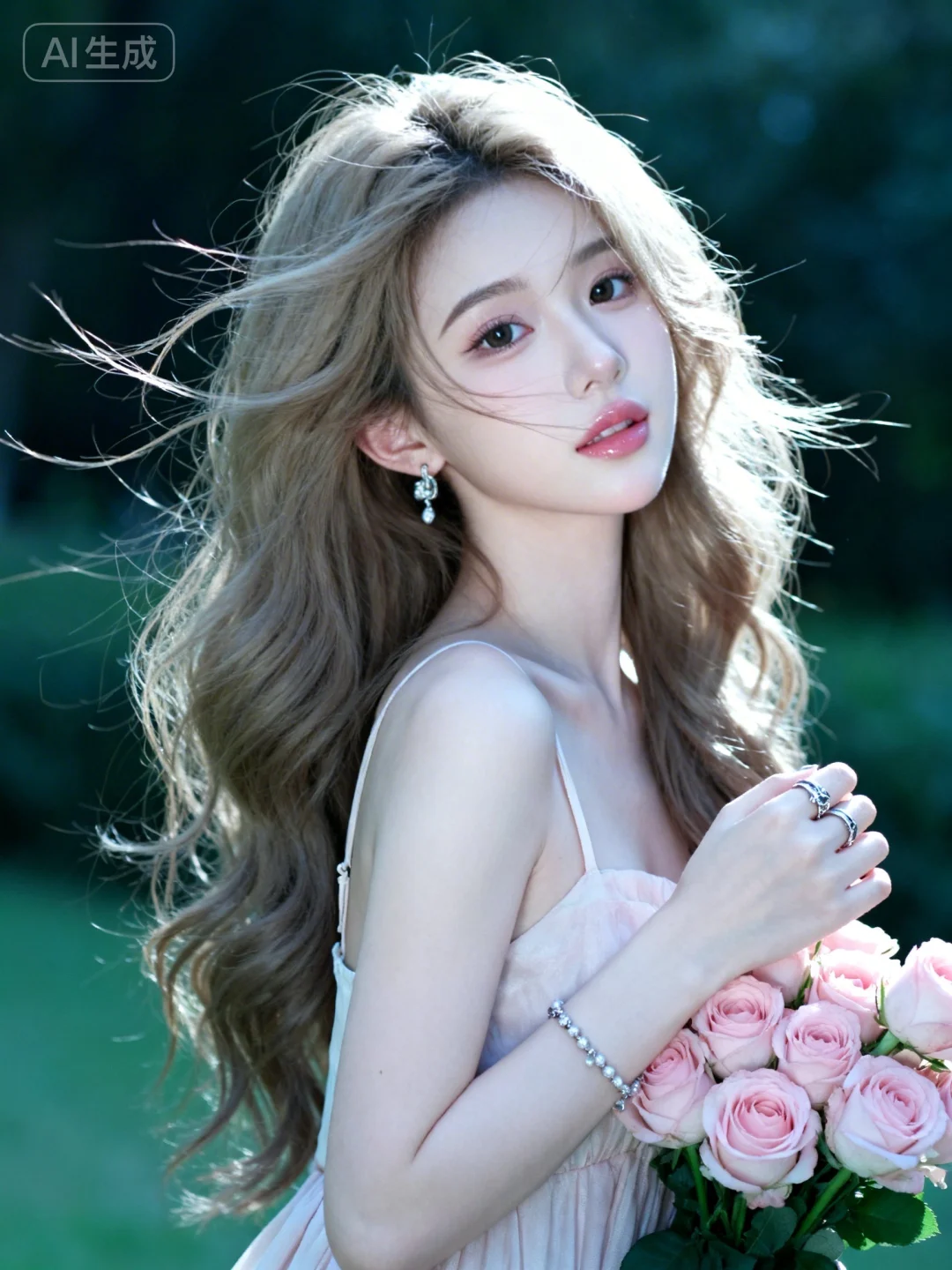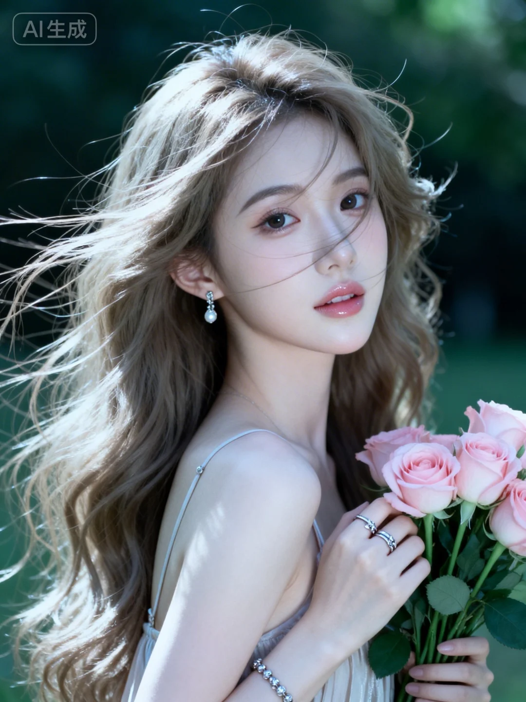 真实摄影,头部特写,亚麻色长发,佩戴耳饰、手链、戒指,身穿吊带长裙,手持粉色玫瑰花束,背景是户外绿意,整体风格优雅、浪漫,充满鲜花结合的氛围感,(电影级面光:1.6),(光线追踪:1.5),(冷白皮漫感质感的光滑皮肤:1.7),(人物有最好的骨相:1.2),(网感脸:1.6),(网感妆:1.6)身材完美,莫兰迪配色,高颜值网红,INS风,幼态脸,19岁女生尖下巴,三庭五眼比例均衡,身材娇小,细腻陶瓷水嫩肌肤,偏冷白皮,随机的妆容,随机的饰品,随机的动作,侧光,发丝轻飘,凌乱,随机角度拍摄,总体有很多的不确定性,但又好看,