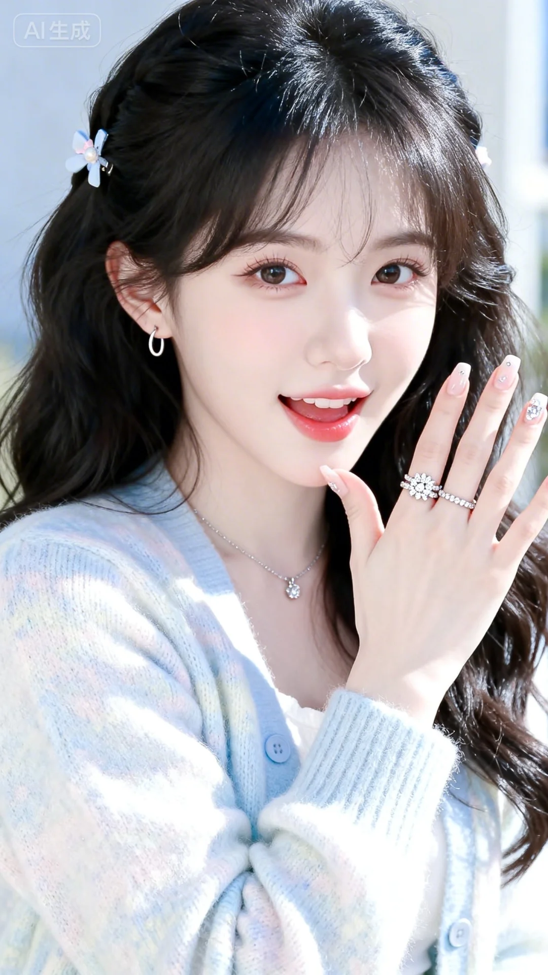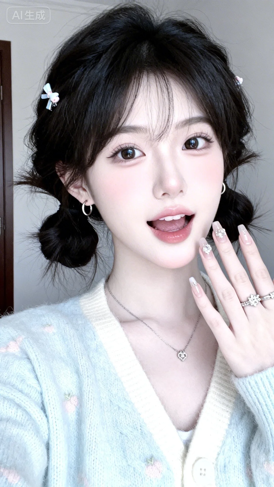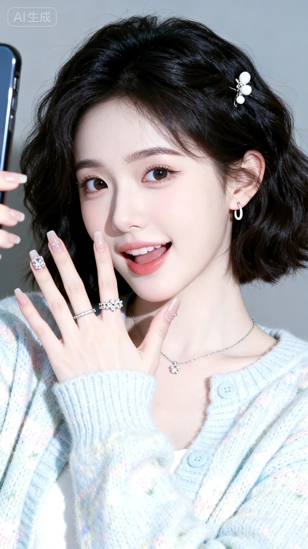 手机拍摄风格,超低分辨率,画面中是一位白皙甜妹,冷白皮,具有少女感,头发浓密,韩系发型有小的发饰,淡色可爱风细节设计毛衣或者开衫,可爱表情,调皮的,灵动的,简约耳环戒指项链。美甲,碎钻戒指,唯美,氛围感。姿势合理,摆pose,光明亮