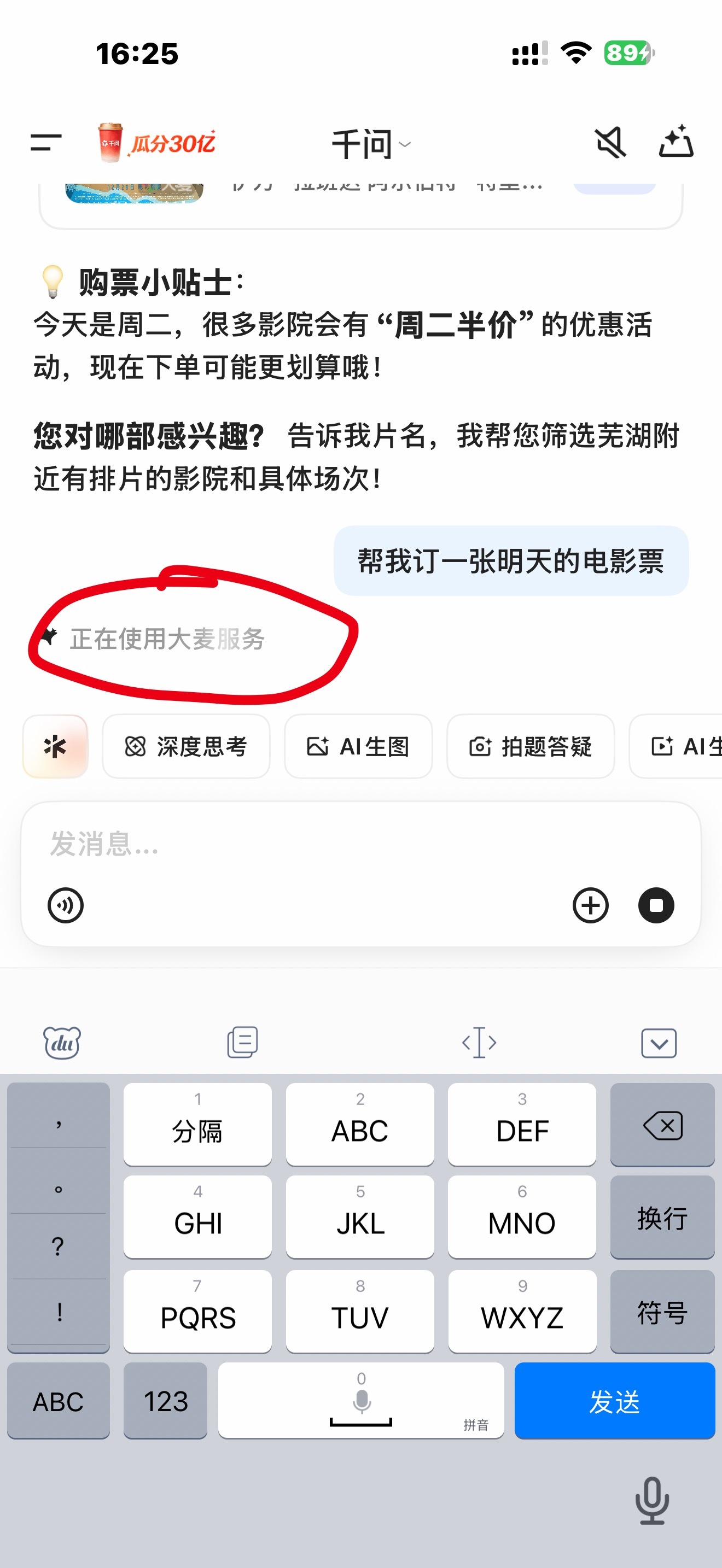 千问接入大麦千问测试AI买电影票能力春节和家人朋友约电影,最烦就是来回切APP挑片、选座、买票,流程琐碎又费时间。