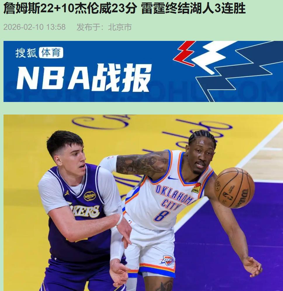 未来已经不是在敲门了,是雷霆这群小子直接踹门进来了!把“夕阳红”湖人砸得晕头转向。 都说湖人三巨头稳了?稳在哪?看最后五分钟,老詹扶着膝盖喘气,回头杰伦·威廉姆斯已经冲进去暴扣了。太扎心了。湖人是在拼油箱里还剩的油,雷霆纯靠一双双年轻的腿在飞。你这边刚进一个,人家眨眼间就快攻反击扣篮了。这节奏,就像让一辆老爷车去追高铁。 湖人球迷最憋屈的是第三节。明明反超了8分,眼瞅着有戏,结果呢?咔嚓一下,被卡鲁索和乔一连串三分雨给浇灭了。外线防守跟不存在似的,到处漏人。斯马特再能追,也补不上全队的窟窿。这防守,简直是个漏勺。 说到底,湖人这阵容缺陷太明显,疼得没法忽视。内线看着唬人,艾顿碰到霍姆格伦这种灵活的就软,海耶斯更是指望不上。外线?除了里夫斯还能持球打打,其他人接球投都手抖。最要命的是体力,老詹一下,整个进攻就便秘。你还能指望39岁的场场超神? 反观雷霆,人家摆烂攒的家底是真香。霍姆格伦能护框能拉出去,杰伦·威廉姆斯关键时刻手硬得不像年轻人。更别说卡鲁索,从湖人出去的,今天成了最冷静的“复仇者”。他们全场9人得分,替补轰下40分,这就是深度,这就是活力。 所以别老说詹姆斯是“甩锅”还是“带不动”了。局面很清晰:湖人缺的不是多一个球星,缺的是能跟着年轻人一起跑、一起拼的狠劲儿。篮球不说谎,跑不动就得挨打。雷霆赢得痛快,是因为他们舍得跑,敢于拼。湖人要想不一直“啃老”啃到秃,要么赶紧交易补上锋线的坑,要么狠下心来练新人。时代变了,未来的大门,永远向跑得更快的人敞开。詹姆斯22+10杰伦威23分 雷霆终结湖人3连胜