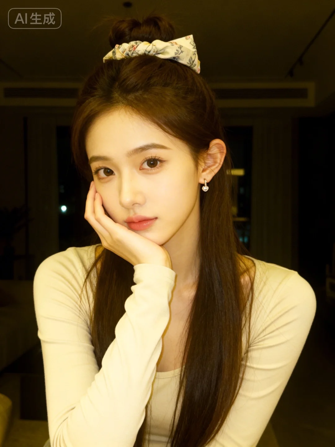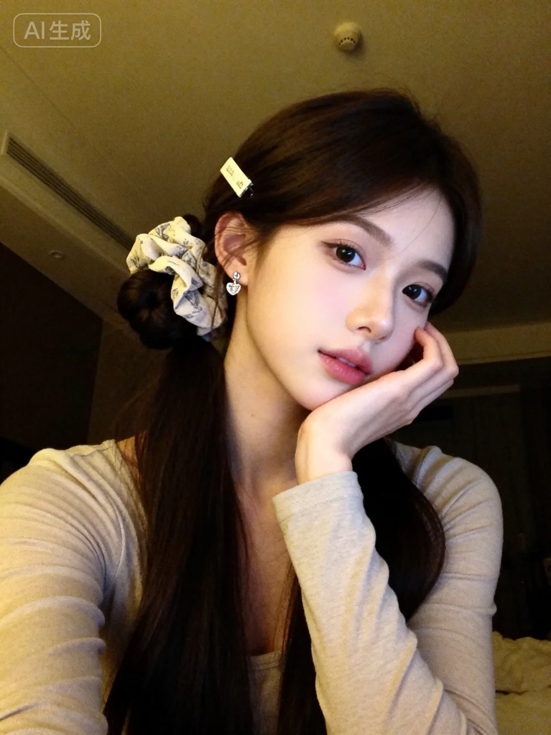 日常快照风格,非精心构图或打光,冷白皮,皮肤白皙通透,一位亚洲美女(瓜子脸,尖下