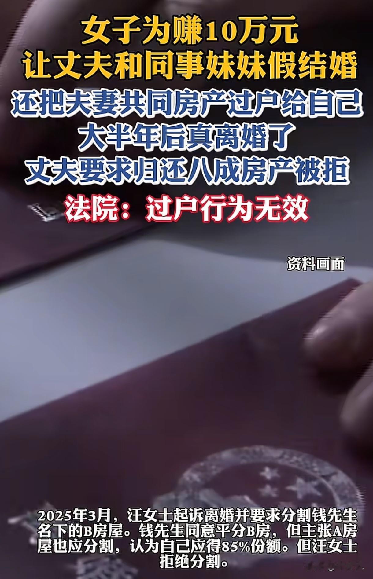“细思极恐的枕边人!”安徽,男子和女子结婚后,将自己一套婚前房产登记为夫妻两人共有,两人各占50%的份额。之后妻子跟男子说,让男子把房子过户给她,两人先假意离婚,让男子和同事妹妹结婚,可以拿10万酬金。男子把房子给了妻子,可两人还没办完离婚手续,同事就告诉他们事情作罢,男子本以为自己能和妻子一如既往的过日子,可没想到,妻子却把他告上法庭,起诉离婚,还要求分割男子名下的另一套房子,男子傻眼了。 2019年9月,钱先生和汪女士喜结连理,婚后夫妻感情融洽,生活幸福。 2021年1月,钱先生出于对妻子的爱意和信任,将自己婚前购买的A房屋,登记为夫妻两人共同所有,两人各占50%的份额。 2024年5月,汪女士跟钱先生说,自己同事邵某家面临拆迁,为了多获得一些利益,想找个单身男子和自己妹妹结婚,并且承诺,事成后,可以给对方10万元酬谢。 汪女士心生一计,她让钱先生先把A房屋过户到自己名下,然后两人假装离婚,等钱先生和对方结婚,拿到10万元酬金后,两人再复婚。 钱先生也没有多想,按照妻子的要求,去照办了,他先把A房屋过户给汪女士,随后提交了离婚申请书。 然而,计划赶不上变化,邵某那边却突然说不需要找人结婚了,这件事情就这么作罢。 这时候,钱先生和汪女士虽然提交了离婚申请,但两人还没去办理正式的离婚登记手续。 钱先生原本想着自己和妻子还能像以前一样好好过日子,可他万万没想到,他们夫妻却闹起了离婚。 2025年3月,汪女士向法院起诉离婚,并且要求分割钱先生名下的另外一套B房屋。 钱先生对于离婚这件事,并没有过多反对,他也同意和汪女士平分B房屋。 但是,对于之前过户给汪女士的A房屋,钱先生觉得这房子是自己购买的,虽然之前登记为两人共有,但后来过户给汪女士是基于假离婚的荒唐计划,自己理应获得85%的份额。 而汪女士却坚持认为,钱先生已经把房子赠予给了自己,而且双方已经办理了产权登记,那这套房屋就是自己的,所以不同意分割。 钱先生当初出于对妻子的爱和信任,将婚前房产登记为夫妻共有,后来又因为妻子提出的荒唐计划,将房屋过户给她,结果却落得如此局面,实在是令人同情。 而汪女士为了所谓的“赚钱计划”,利用丈夫的信任,将房屋过户到自己名下,之后又起诉离婚。 那么,这套房屋到底应该归谁所有,法院会如何审理判决呢? 《民法典》第1062条规定:夫妻在婚姻关系存续期间所得的财产,为夫妻的共同财产,归夫妻共同所有,但是有约定的除外。 钱先生将婚前购买的A房屋登记为夫妻两人各占50%份额,这可以视为钱先生对汪女士的一种赠与行为,此时A房屋属于夫妻共同财产。 而之后钱先生将A房屋过户给汪女士,是基于为了获得不正当利益,并非是钱先生的真实意愿,所以这种过户行为无效。 最终法院判决准许两人离婚,登记在钱先生名下的B房屋扣除房贷后,由两人平分,该房屋归钱先生所有,钱先生向汪女士支付房屋折价款。 A房屋归汪女士所有,汪女士向钱先生支付一半房屋折价款。 相互扣减后,汪女士还需向钱先生支付4万余元。 在婚姻生活中,无论是出于何种目的,都不能轻易拿婚姻和财产开玩笑,从法律角度来说,是没有假离婚一说的。 一旦夫妻双方办理离婚手续,那两人就不再是夫妻,所签署的离婚协议书也是有法律效力的,这种情况下,给出去的财产是很难要回来的。 对于此事,大家怎么看?