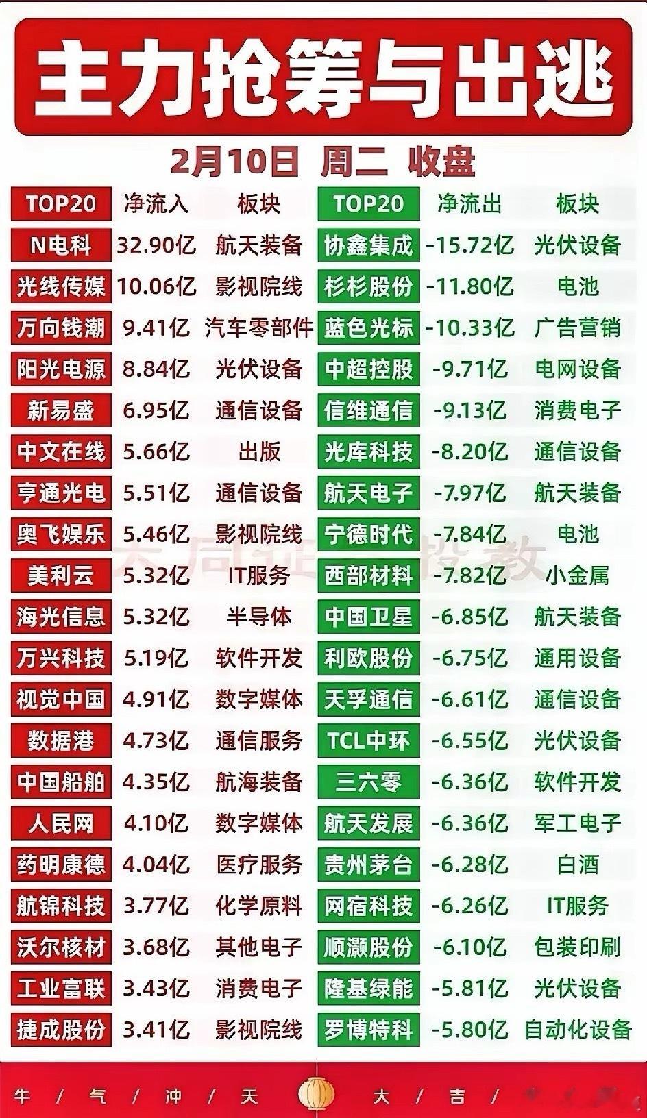 今日(2.10)主力资金净流出个股梳理分析!今日收盘主力资金呈现显著的板块分化特征:净流入端聚焦航天装备、影视院线、汽车零部件、通信设备等高景气赛道,N电科、光线传媒、万向钱潮等个股获资金大幅追捧;净流出端则集中在光伏设备、电池、广告营销、通信设备等前期热门板块,协鑫集成、杉杉股份、蓝色光标等个股遭资金撤离,反映出市场在高景气赛道与调整板块之间的资金腾挪,同时AI及春节档相关概念获资金追捧,而部分成长赛道则因获利盘兑现出现调整。 净流出个股分析1. 协鑫集成:净流出15.72亿,所属光伏设备板块,主力资金大幅撤离,股价此前获尾盘抢筹,今日因光伏板块整体调整及获利盘兑现,资金流出规模居首。2. 杉杉股份:净流出11.80亿,所属电池板块,主营锂电池材料及新能源业务,受行业竞争加剧及价格波动影响,资金撤离,股价随板块调整。3. 蓝色光标:净流出10.33亿,所属广告营销板块,主营数字营销及AI营销业务,受市场风格切换影响,资金从AI营销题材股撤离,股价回调。4. 中超控股:净流出9.71亿,所属电网设备板块,主营电缆及新能源业务,受行业竞争及业绩波动影响,资金撤离,股价下跌,市场对其盈利稳定性存疑。5. 信维通信:净流出9.13亿,所属消费电子板块,主营射频器件及消费电子业务,受行业需求疲软及竞争加剧影响,资金撤离,股价调整。6. 光库科技:净流出8.20亿,所属通信设备板块,主营光通信及算力设备,受板块轮动及获利盘兑现影响,资金撤离,股价随通信板块回调。7. 航天电子:净流出7.97亿,所属航天装备板块,主营航天电子设备及系统集成,受军工板块调整及订单交付节奏影响,资金撤离,股价下跌。8. 宁德时代:净流出7.84亿,所属电池板块,全球动力电池龙头,受行业价格战及增速放缓影响,资金撤离,股价调整,市场对其盈利增长预期下调。9. 西部材料:净流出7.82亿,所属小金属板块,主营稀有金属材料及制品,受贵金属价格波动及行业周期影响,资金撤离,股价随小金属板块下跌。10. 中国卫星:净流出6.85亿,所属航天装备板块,主营卫星制造及应用业务,受军工板块调整及市场情绪影响,资金撤离,股价回调。11. 利欧股份:净流出6.75亿,所属通用设备板块,主营数字营销及投资业务,受市场风格切换影响,资金从题材股撤离,股价随板块调整。12. 天孚通信:净流出6.61亿,所属通信设备板块,主营光通信器件及CPO业务,受板块轮动及获利盘兑现影响,资金撤离,股价随光模块板块调整。13. TCL中环:净流出6.55亿,所属光伏设备板块,主营光伏硅片及电池片,受光伏行业产能过剩及价格下跌影响,资金撤离,股价随板块下跌。14. 三六零:净流出6.36亿,所属软件开发板块,主营AI应用及安全业务,受AI板块回调及市场情绪影响,资金撤离,股价小幅下跌。15. 航天发展:净流出6.36亿,所属军工电子板块,主营航天防务及电子信息业务,受军工板块调整及订单交付节奏影响,资金撤离,股价下跌。16. 贵州茅台:净流出6.28亿,所属白酒板块,白酒龙头,受消费复苏不及预期及资金风格切换影响,资金撤离,股价小幅下跌,市场对其短期增长持谨慎态度。17. 网宿科技:净流出6.26亿,所属IT服务板块,主营算力租赁及边缘AI业务,受板块轮动及获利盘兑现影响,资金撤离,股价随算力板块调整。18. 顺灏股份:净流出6.10亿,所属包装印刷板块,主营包装印刷及新型烟草业务,受政策监管及业绩不及预期影响,资金撤离,股价大幅下跌,避险情绪升温。19. 隆基绿能:净流出5.81亿,所属光伏设备板块,全球光伏组件龙头,受行业产能过剩及价格下跌影响,资金撤离,股价随板块调整,市场对行业复苏节奏存疑。20. 罗博特科:净流出5.80亿,所属自动化设备板块,主营光伏自动化设备及AI业务,受光伏板块调整及市场情绪影响,资金撤离,股价随板块回调。 总结今日收盘主力资金净流出端主要集中在光伏设备、电池、通信设备、航天装备等前期热门板块,协鑫集成、杉杉股份、蓝色光标等个股净流出规模领先,反映出市场对光伏、电池等赛道的获利兑现,以及对AI及消费电子等板块的情绪降温。整体来看,资金从成长赛道撤离,转向航天装备、影视院线等高景气领域,板块轮动特征显著,市场风险偏好有所收缩。本文涉及资讯、数据等内容来自网络公共信息,仅供参考,不构成投资建议!