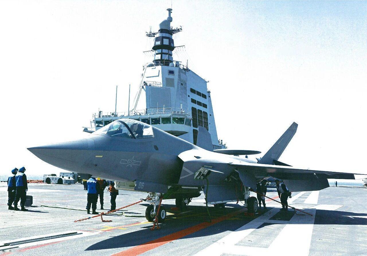 “福建舰”甲板上开启弹舱和进气道检修口的歼-35战斗机 这张照片能上军事杂志了!