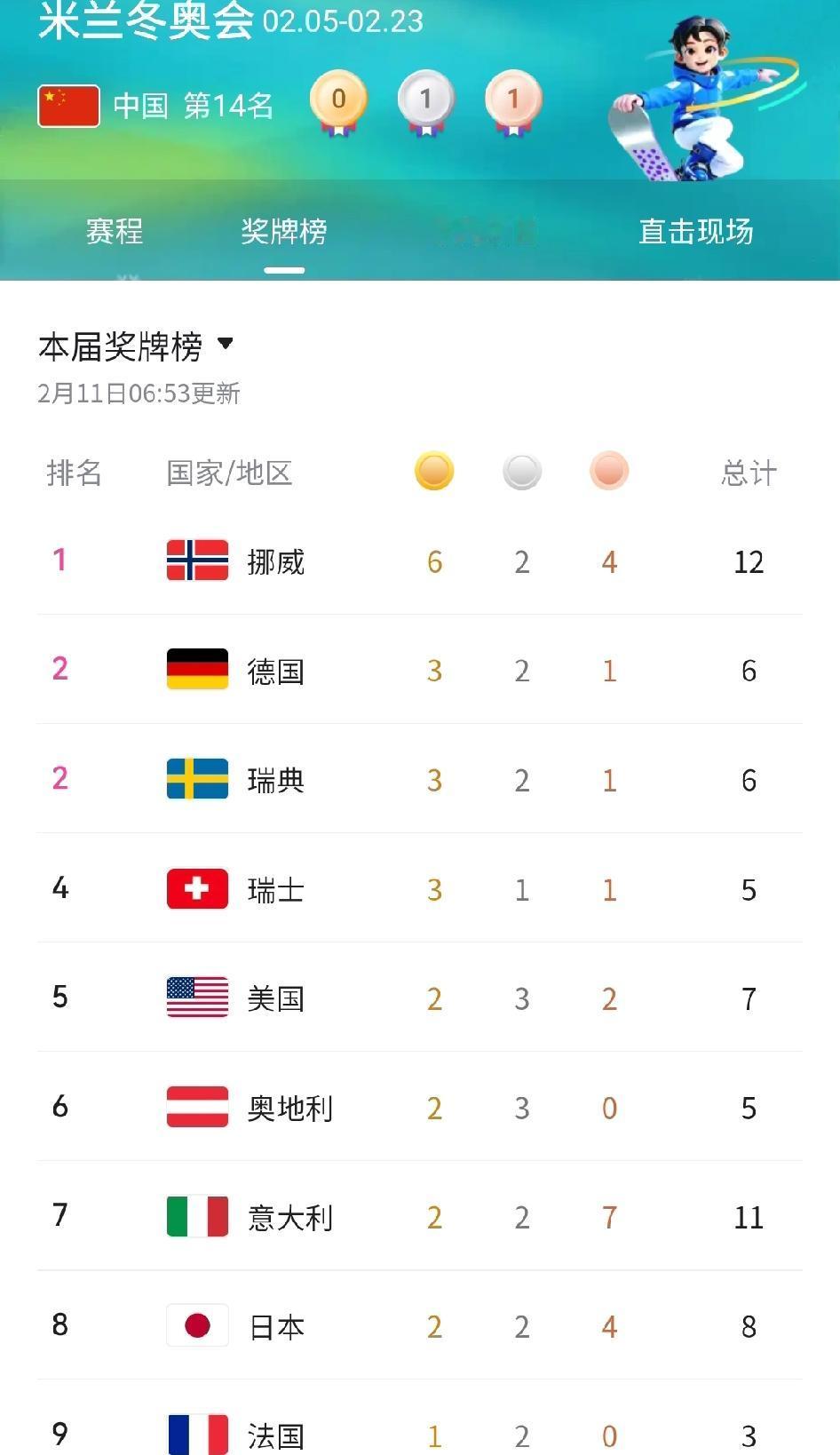 米兰冬奥比赛第四日,挪威队大爆发,重现往日王者风采,单日豪取3金1银2铜,以6金2银4铜独一档高居奖牌榜榜首,是奖牌总数唯一过双的代表队。中国今天颗粒无收,已下滑至奖牌榜第14位,美国队今天收获3银2铜的不俗战绩,以2金3银2铜位居奖牌榜第五,日本仍然是保持在前十的唯一亚洲国家。 挪威是史上老牌冰雪强国,本届米兰冬奥的确是兵强马壮,今天在自由式滑雪男子坡面障碍技巧、越野式滑雪男子古典式冲刺、冬季两项男子20公里个人摘得3金2铜,其中后两项更是包揽金牌🥇和铜牌🥉,另外,挪威队在跳台滑雪混合团体获得1枚银牌。