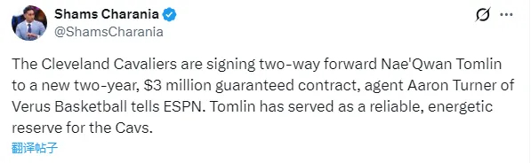 25岁汤姆林正式转正,据ESPN名记Shams报道,骑士与双向合同球员内匡-汤姆林达成一份2年300万美元的完全保障合同,这是骑士能够给他的最高薪水;汤姆林填补骑士阵容最后一个名额,辅佐哈登和米切尔冲击总冠军。