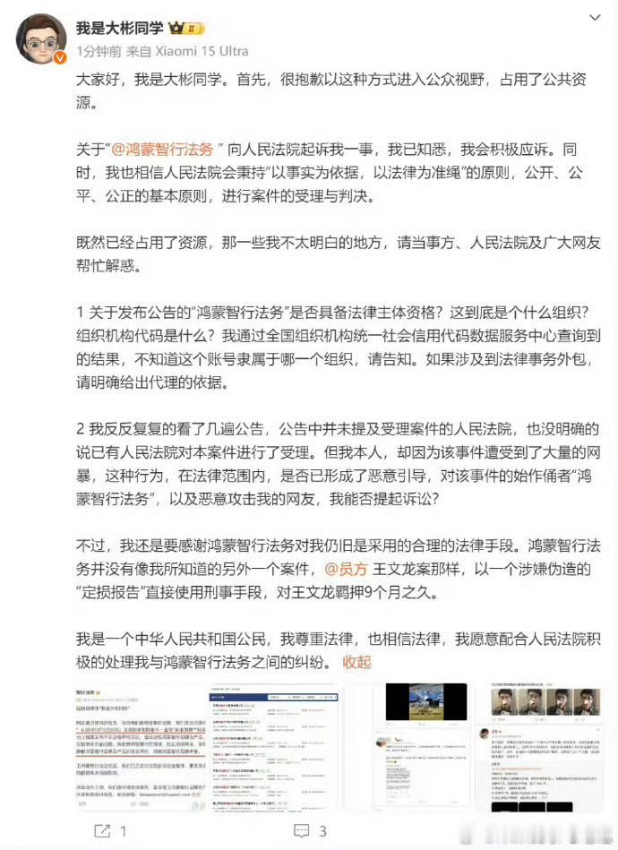 当初被起诉时回复积极应诉,配合处理纠纷,现在一天没发博了,不出来走两步我是大彬同