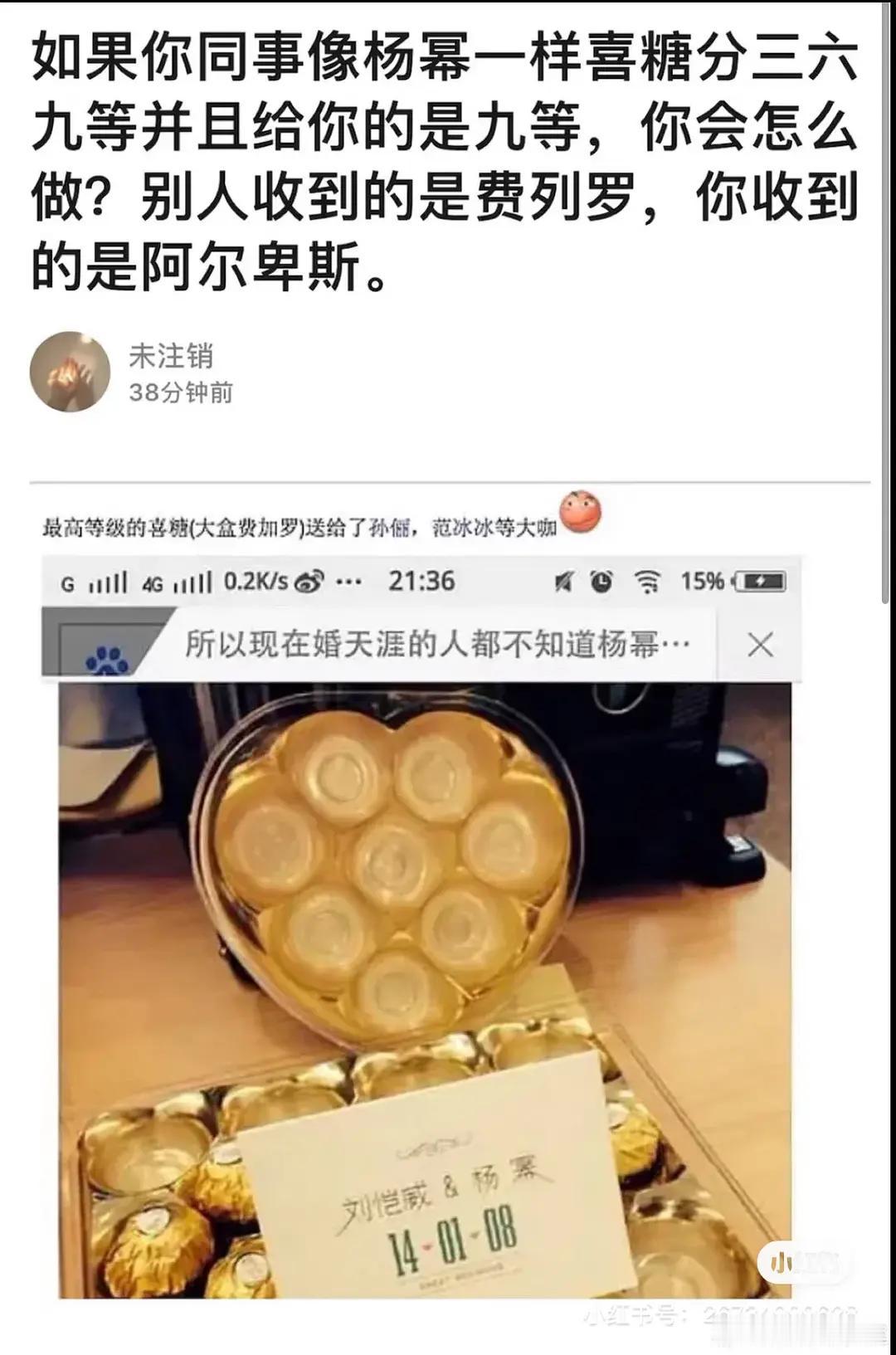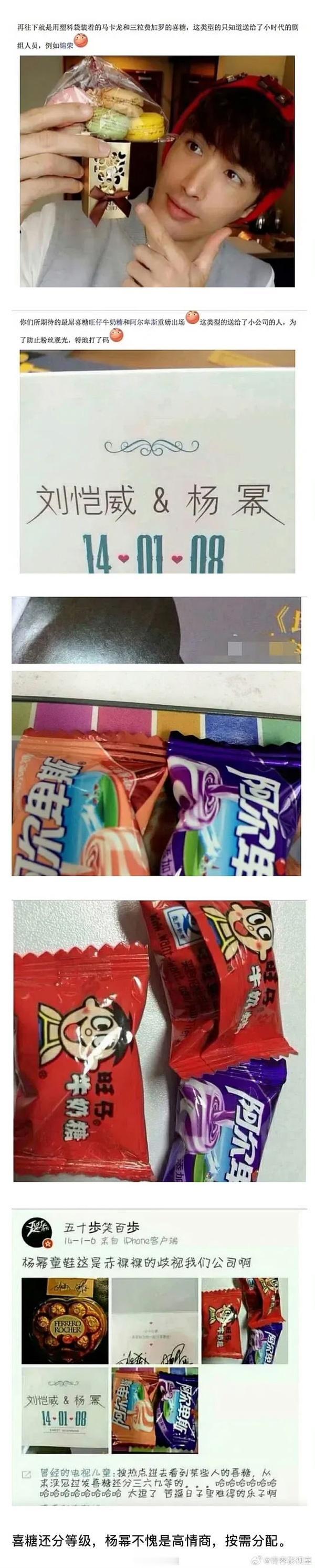 杨幂估计真的后悔因为一个“C位”得罪顶流粉丝了吧,本来都已经靠多年沉淀快转型大花了,如今可倒好,连当年结婚时的喜糖事件都被人翻出来了。 我对她和刘恺威结婚时的“喜糖”事件有耳闻,但也是今天才知道杨幂的喜糖分为大盒费列罗、小盒费列罗、马卡龙、旺仔牛奶糖,以及阿尔卑斯糖。 如此划分,也难怪能在十多年后再次引起讨论,当时他们说这是刘恺威选的喜糖、他分的喜糖。但是我后来看那个披哥真的觉得很疑惑,刘恺威在这节目里说他没内地驾照,0几年就来内地拍戏,却连驾照都懒的换,还有心思来区分内地结婚习俗、分得清这些喜糖的好劣高低,还有内娱明星的咖位大小吗? 不过如今喜糖事件也成了罗生门,到底谁准备的喜糖已经无从知晓,只剩下“经久不衰”的故事让不了解这件事的网友再次讨论