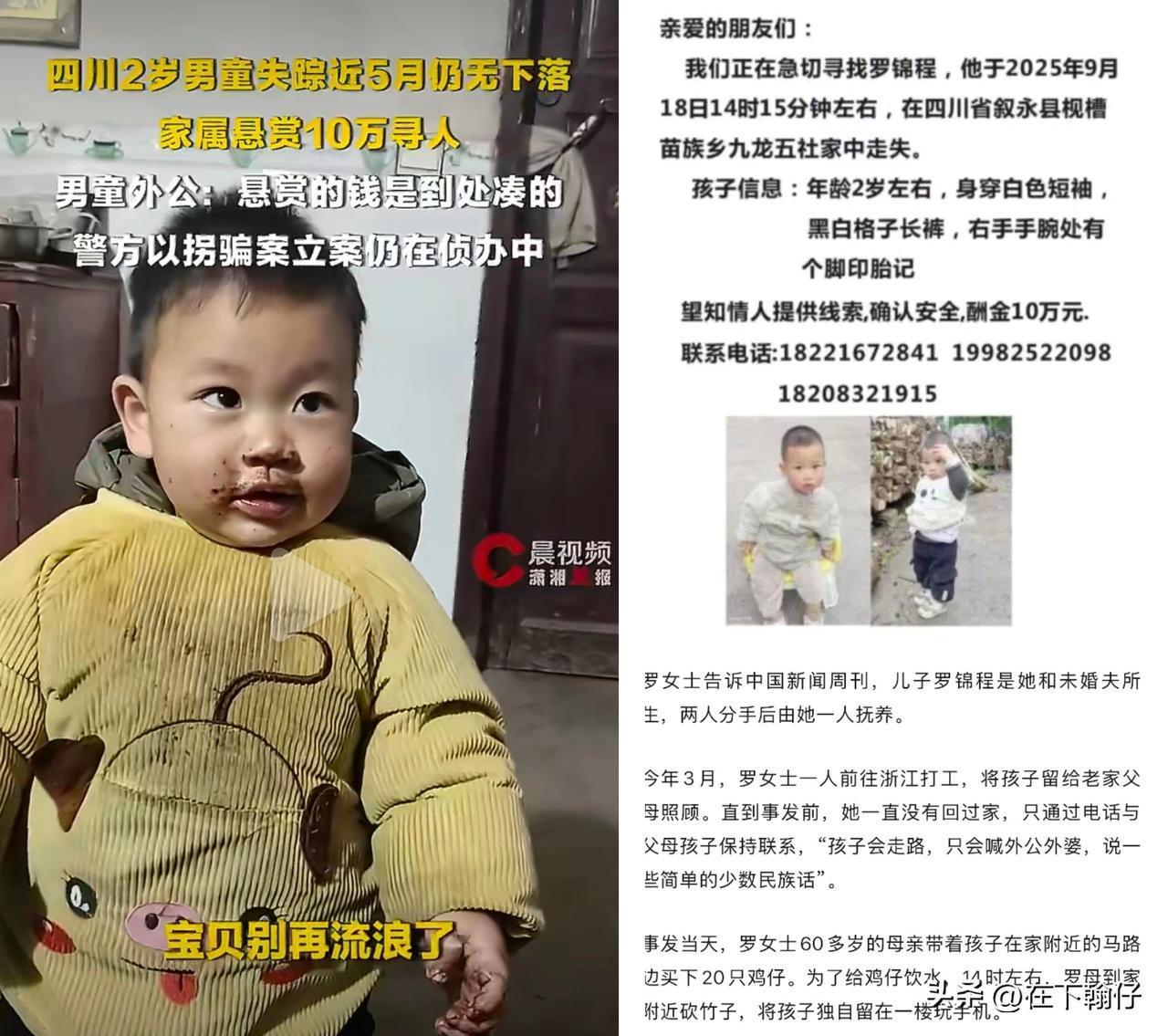 快过年了,让罗锦程回家! 四川泸州,两岁的罗锦程已经失踪140多天了。 那天下午,他在家中玩耍时消失。手机流量在14:15停止运行,成了最后的时间标记。家门口的监控没有拍下可疑身影,方圆十公里的山林河流,警方动用无人机热成像、搜救犬反复搜寻,没有体温信号,没有衣物残迹,没有遗体痕迹。 五个多月了,案子以“拐骗”立案,家属悬赏十万元,线索为零。 母亲对着镜头,含泪说:“等你回家过年。” 140天。两岁的孩子,可以长高几厘米,学会说新的话。他可能已经不记得自己叫罗锦程了——但只要他还在,就还有叫回这个名字的那天。 比起别的可能,人们更愿意相信他是被拐走了。因为那至少意味着,他还在这世上。还在某个地方。还会长大,还会被找到。 快过年了。万家灯火里,有一盏灯,彻夜不熄。等一个两岁的孩子推门跑进来。