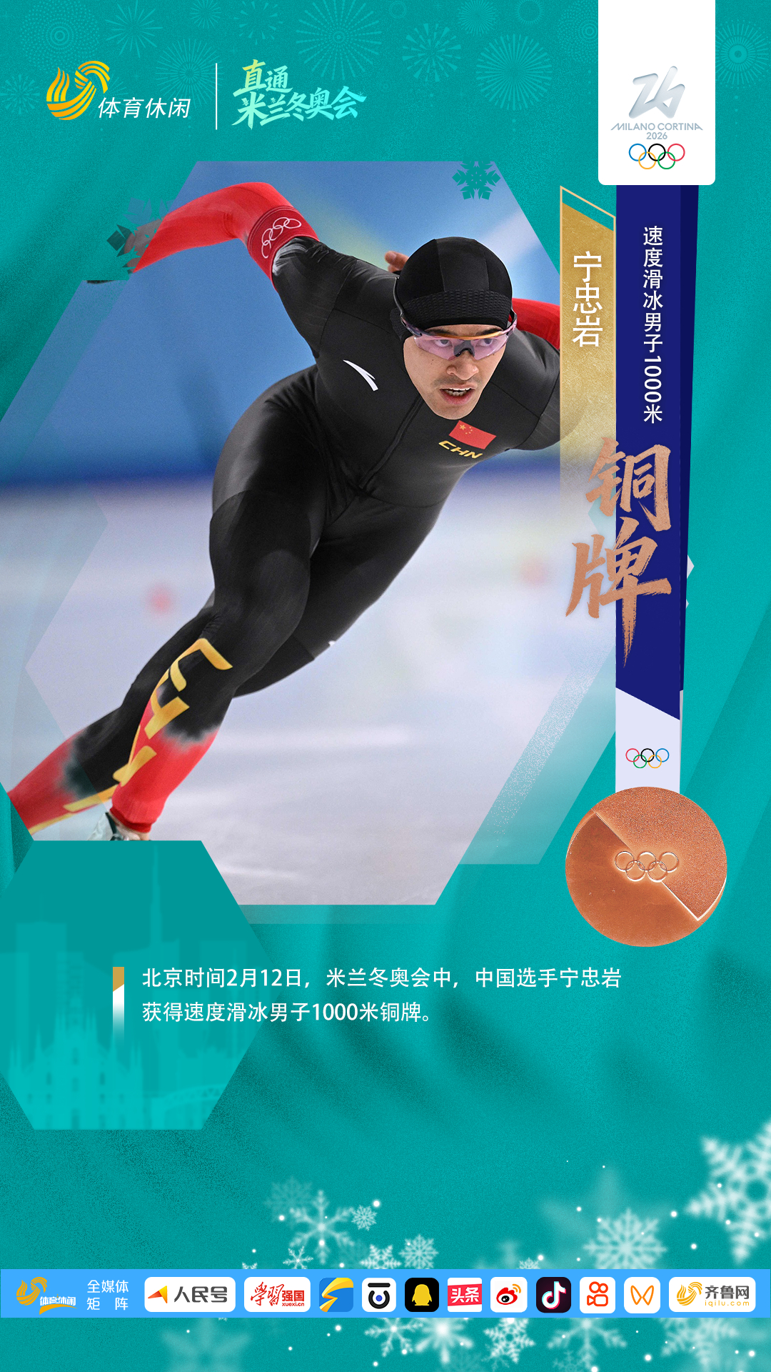 米兰冬奥会速度滑冰男子1000米比赛,中国选手宁忠岩摘铜,这是米兰冬奥会中国代表团获得的第2枚铜牌,同时这也是中国男子速滑选手在冬奥会该项目上的首枚奖牌,创造了中国速滑新历史。宁忠岩速滑1000米摘铜中国速滑米兰冬奥首枚奖牌