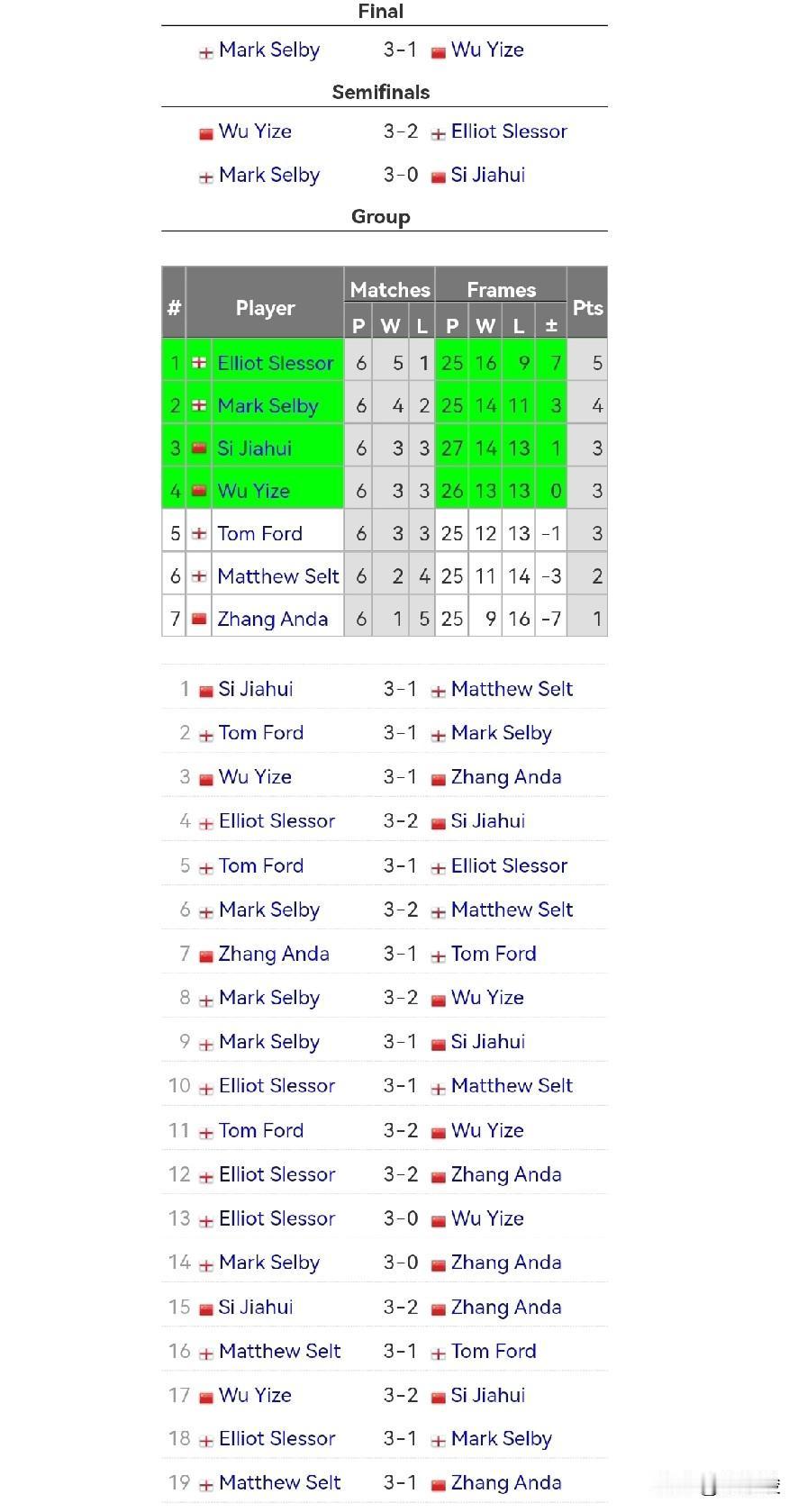 冠军联赛冠军组比赛结束,塞尔比3-1胜吴宜泽,获得冠军,成功卫冕。吴宜泽获得亚军,斯佳辉进前4。 冠军联赛冠军组的比赛在经过两天的比赛后,今天凌晨收官,塞尔比在决赛中3-1战胜吴宜泽,获得冠军,成功卫冕。 小组循环赛凌晨结束后,进前4的分别是:斯莱瑟、塞尔比、斯佳辉、吴宜泽。之后进行的交叉半决赛,吴宜泽3-2险胜斯莱瑟,塞尔比3-0胜斯佳辉。接着进行的决赛,塞尔比3-1胜吴宜泽。 塞尔比是2025年的冠军,实话实说,要卫冕这个冠军太难了,首先要获得小组冠军,其次在冠军组比赛中要发挥出色。尤其是这种短局制、充满偶然性的比赛,要走到最后,获得总冠军,难度太大,概率极低,稍有闪失就可能前功尽弃,所以我们不得不承认塞尔比太牛了。 吴宜泽获得亚军也很不错,他和斯佳辉第二天比较幸运,都进了前4。张安达的表现不如预期,小组循环赛结束后垫底。 恭喜塞尔比获得冠军联赛冠军组冠军!