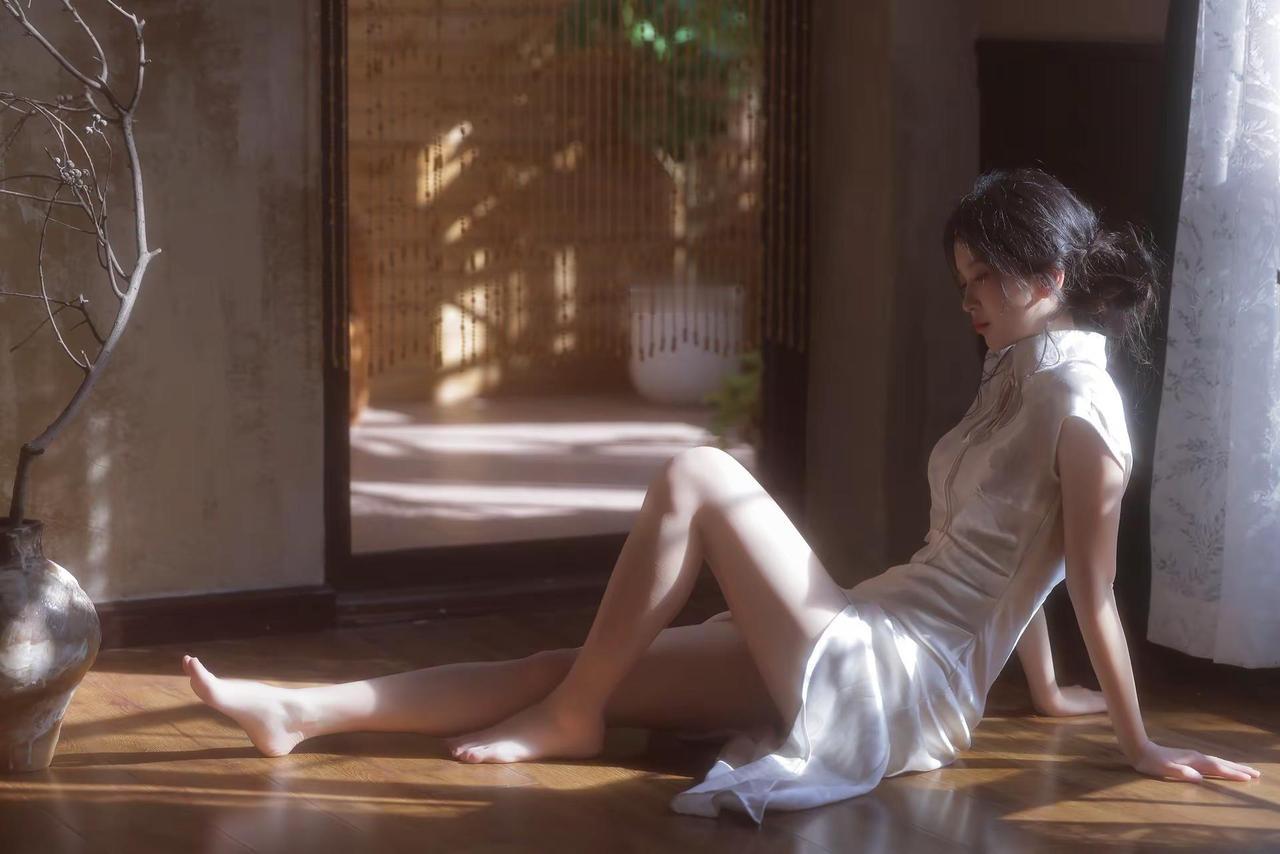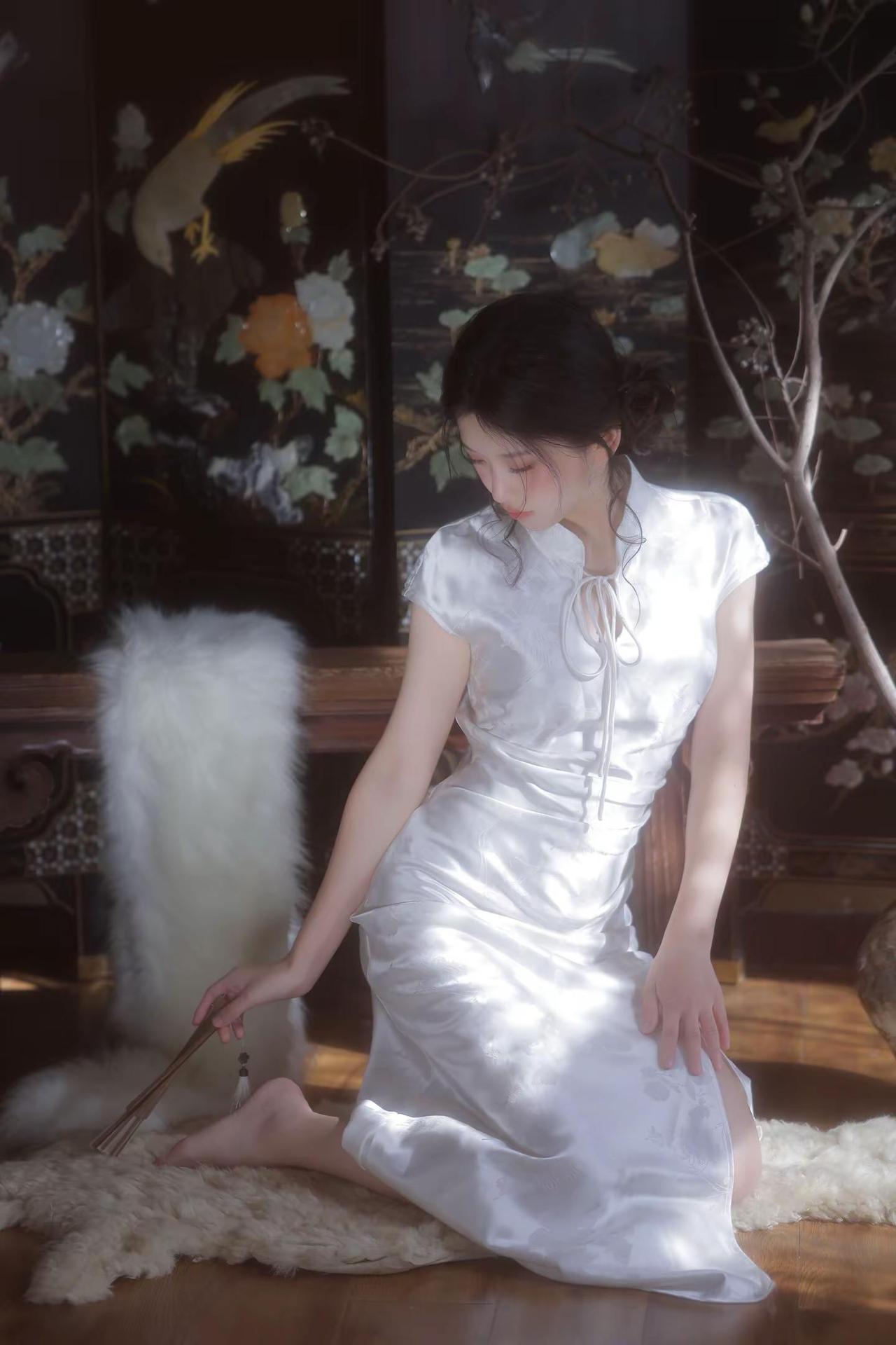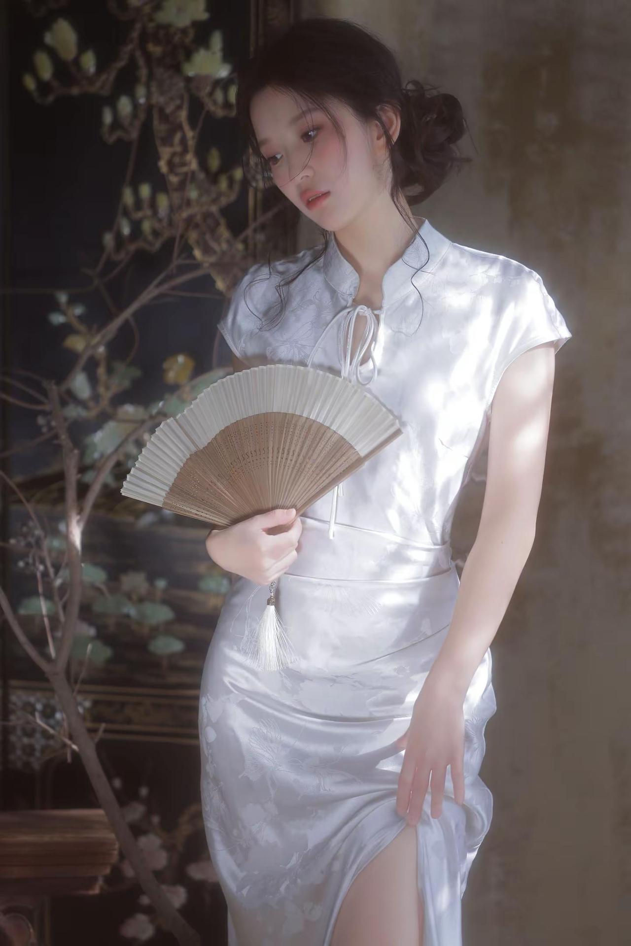 旗袍雅致韵味声,白底素花显风情。青丝如瀑随风舞,容颜绝世韵倾城。
