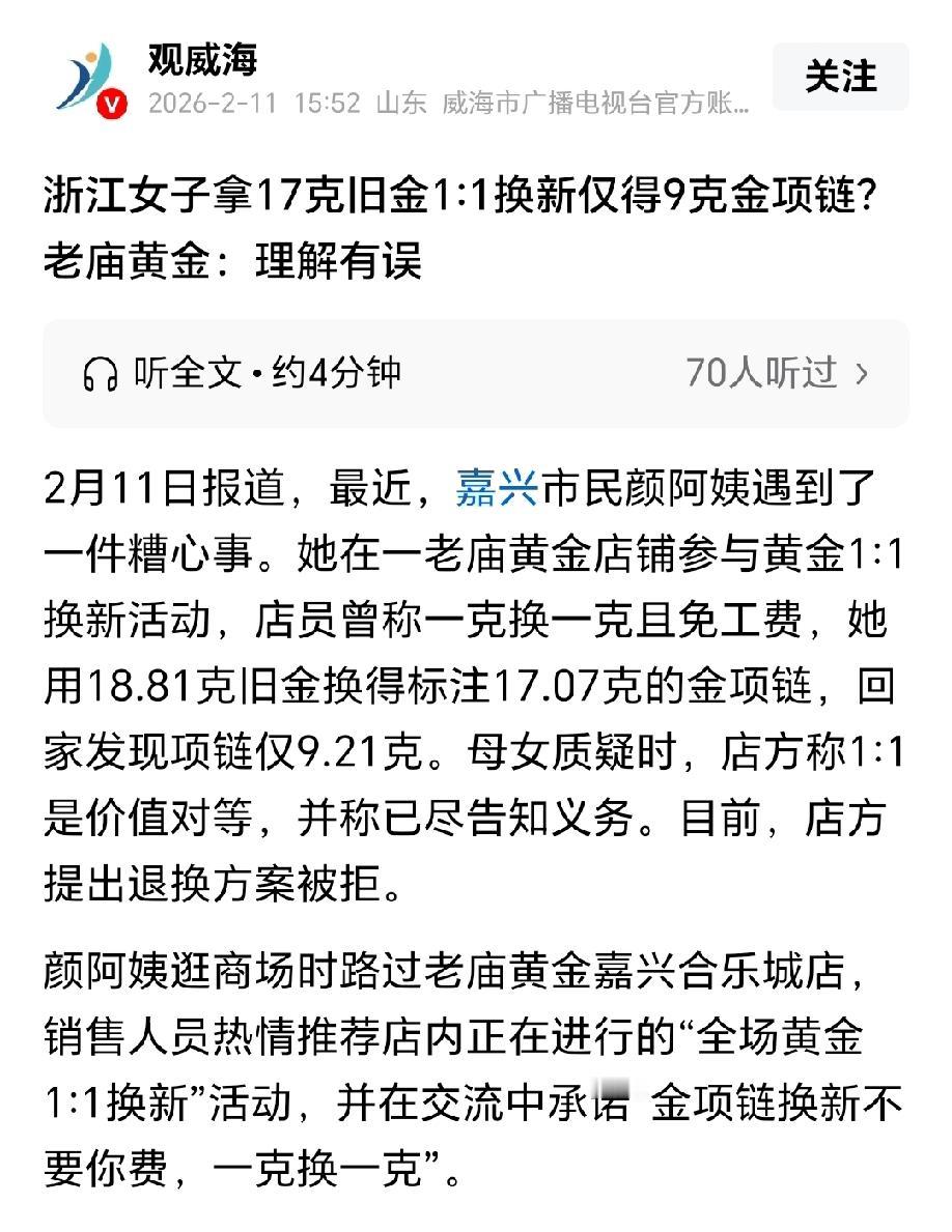 套路太深了!浙江嘉兴,女子看到金店有以旧换新活动,而且是一比一兑换,她觉得很划算,拿出18.81克的旧项链,换了一个标注17.07克的金项链。回家后,女子称重才发现,项链克重只有9.21克,少了近一半。女子当即找金店讨要说法,金店的解释让她怀疑人生。 颜阿姨本想着趁金店以旧换新捡个便宜,把家里旧金项链换成新款,结果却被金店套路,黄金克重少了将近一半。 那天,颜阿姨逛商场时,路过一家金店,店员特别热情,主动上前推荐店里正在做的“全场黄金1:1换新”活动。 店员反复跟她说,旧金换新项链不用额外花钱,一克换一克,还免工费。 颜阿姨琢磨着,家里那几条旧金项链款式老、戴着也不好看,能一比一免费换新,怎么算都划算。 她平时就喜欢戴金首饰,刚好想看看有没有一些心仪的新款式,这一看,让她更加心动不已,当下就决定回家拿旧金来换。 没过多久,颜阿姨带着家里的旧金首饰回到店里,称重一共是18.81克。 在店员的推荐下,她挑了一条新金项链,还顺带换了一颗小金豆。 整个交易过程中,店员没主动给她看项链的吊牌,也没说清楚新项链实际有多重,只告诉她这条项链标注的是17.07克。 颜阿姨的女儿朱女士当时也在现场,无意间瞥见单据上写着“9点几克”。 朱女士心里犯嘀咕,当场就问了店员一句,可店员一口咬定,项链就是17克的,让她们放心,朱女士也不好再问什么。 颜阿姨母女俩没多想,信了店员的话,开开心心拿着新项链回了家。 到家之后,颜阿姨越看新项链越觉得轻飘飘的,跟自己原来18克多的旧项链手感明显不一样。 为了打消内心的猜疑,颜阿姨拿出家里的电子秤称了一下。这一称,母女俩都傻了眼:新项链实际重量只有9.21克,和店员说的17.07克差了快8克,几乎少了一半。 拿出去近19克的旧金,换回来才9克多,这哪里是一比一兑换,分明是吃了大亏。 颜阿姨气的不得了,赶紧翻出和店员的微信聊天记录,上面明明白白写着“一克换一克”,证据摆在眼前,店家不可能抵赖。 母女俩一刻也没耽误,立刻赶回某金店,要讨个说法。 万万没想到,这一次,店家的说法完全变了。 门店负责人出面解释,店里的“1:1换新”根本不是克重一比一,而是价值一比一。 还说店里的换购分两种,一种是克重一比一,但要另收工费;另一种是价值一比一,工费包含在总价里。 颜阿姨选的这条项链售价21567元,单据上的17.075克,不是项链实际重量,是用总价除以当日金价,反推出来需要用这么多旧金来兑换,项链本身就只有9.21克。 对于有没有提前告知的问题,店长坚称全程都讲清楚了,也让顾客自己选。 可朱女士当场反驳,黄金最看重的就是克重,从头到尾,店员没提过一个字关于实际重量,更没说过价值一比一的事。 店家还拿出一段现场视频,可环境太吵,关键对话根本听不清,只能证明换小金豆时提过一句兑换方式。 记者介入后,店长提出可以退货,也可以按克重重新兑换,说之前也愿意处理,只是双方理解不一样,产生了误会。 但颜阿姨母女已经不再信任店家,拒绝了所有协商方案,打算通过法律途径维护自己的合法权益。 黄金以旧换新,千万不能光听店员口头承诺,一定要问清楚是克重兑换还是价值兑换,单据、重量、价格都要核对明白,免得像颜阿姨一样,稀里糊涂吃了亏。