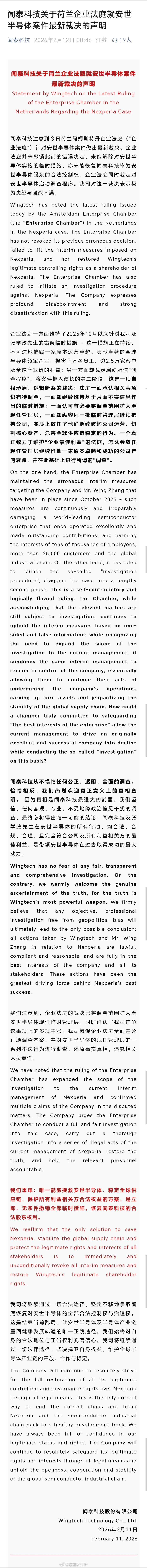闻泰科技注意到今日荷兰阿姆斯特丹企业法庭(“企业法庭”)针对安世半导体案件做出最新裁决。企业法庭并未撤销此前的错误决定,未能解除对安世半导体实施的临时措施,亦未能恢复闻泰科技作为安世半导体股东的合法控制权。企业法庭同时裁定对安世半导体启动调查程序。我司对这一裁决表示极为失望与强烈不满。