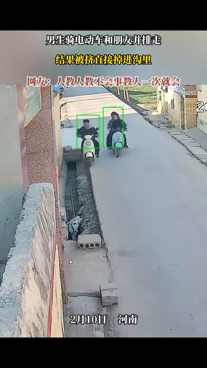 男生骑电动车和朋友并排走,结果被挤直接掉进沟里。 网友:人教人教不会,事教人一次就会。 2月10日河南。