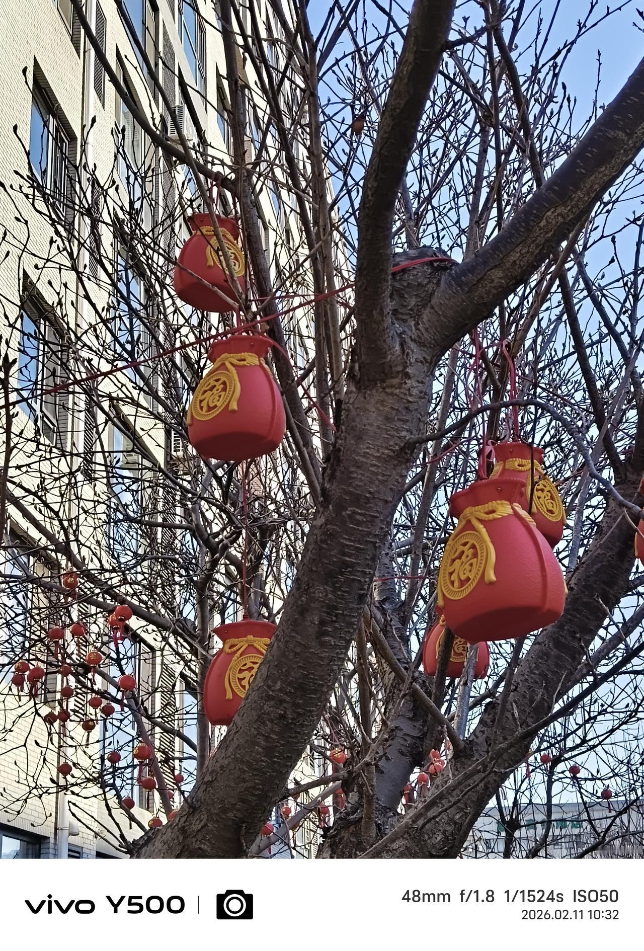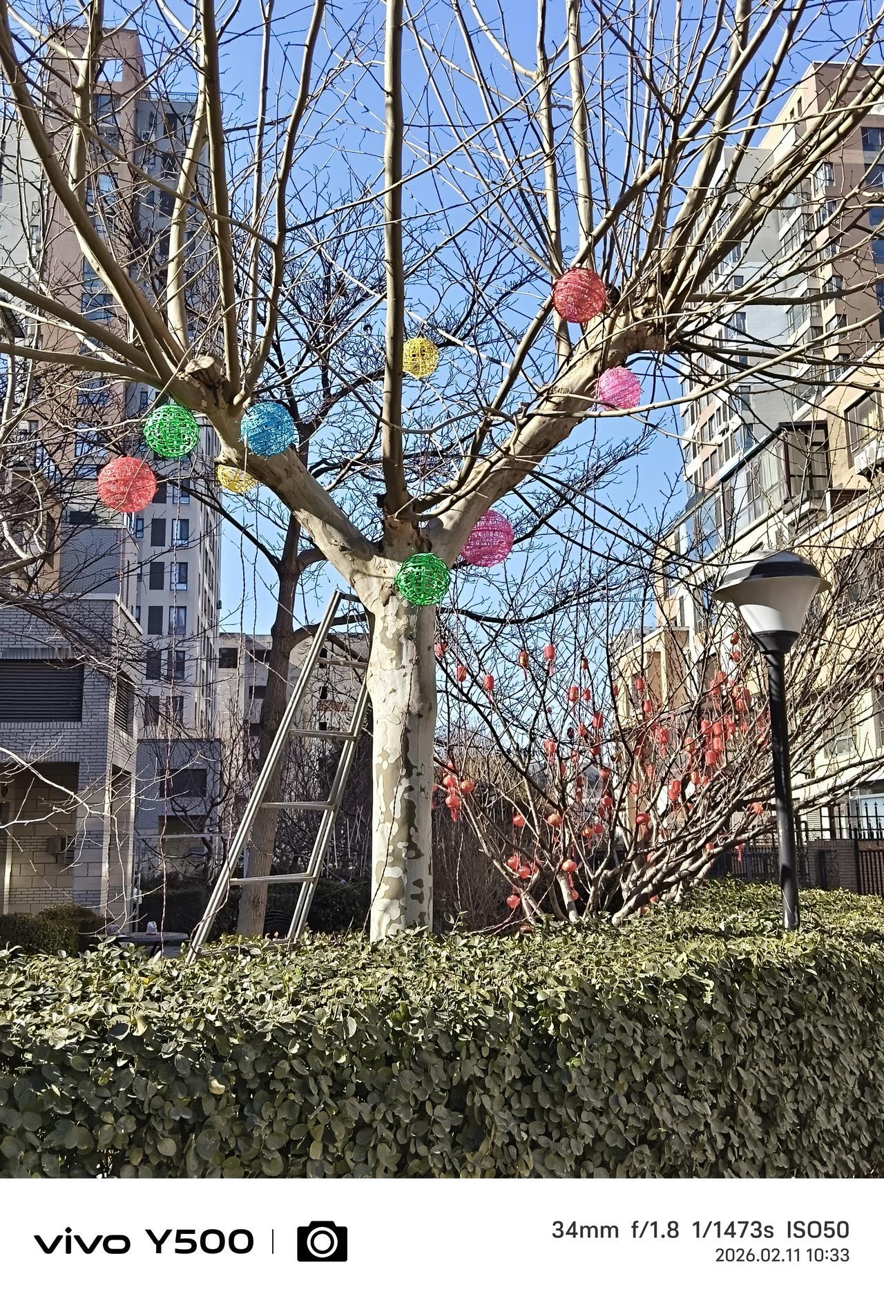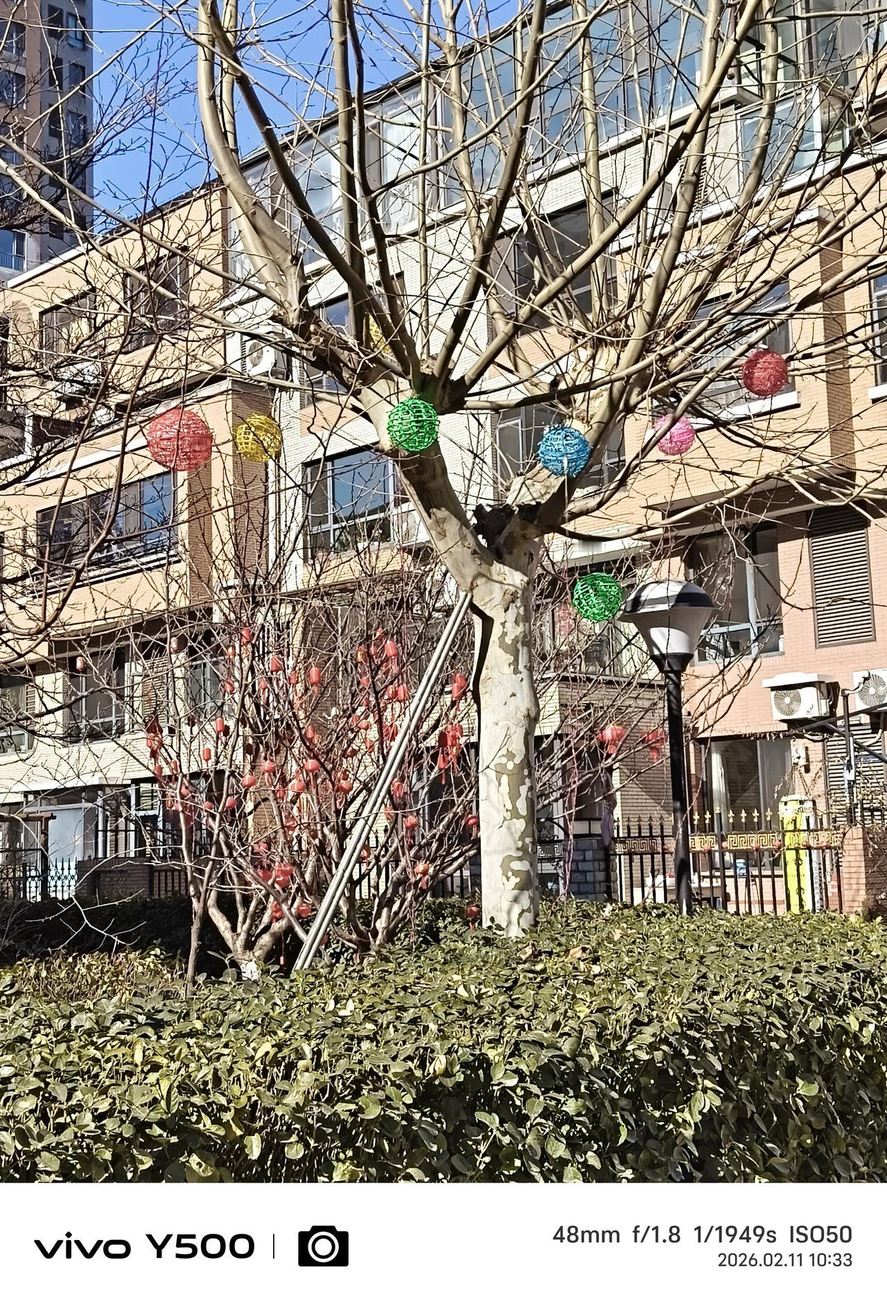 小区里住的一楼的邻居们,在他们的房前屋后的树上挂上各种款式的红灯笼,喜气洋洋,在小区里走过都能感受到的快乐的节日气氛,想起那句歌词:今~咱们老百姓真呀么真高兴! 老祖宗传下来的春节,属于华夏民族的每一个人,不分贫贱富贵,不分种族地域,无论健康疾病,全民平等祖宗相授。