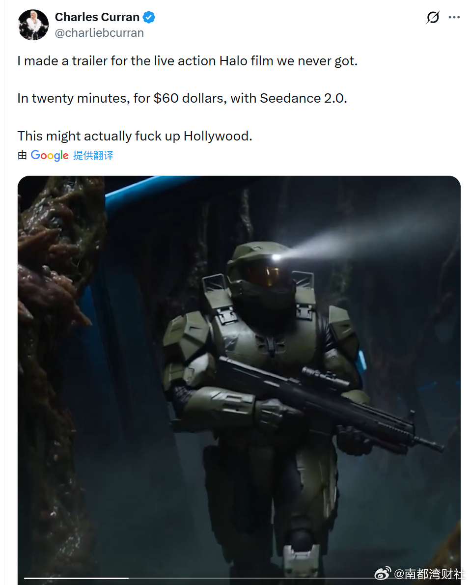 导演Charles Curran透露,他为从未面世的真人电影制作了一版预告片,仅用20分钟,花费60美元,借助Seedance 2.0完成,“这玩意儿说不定真能搞砸好莱坞呢。”在他发布的1分24秒的视频里,做到了电影级画面特效、音画同步、多机位“拍摄”等。