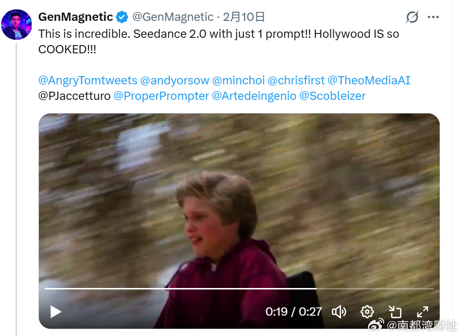 导演Andrew J. Oleck也发布了一条不到30秒的短片,是一个坐着轮椅的小男孩在树林滑落到水中的视频,同时还有旁边小女孩的尖叫、小男孩落水后矮人精灵的出现,整个视频节奏紧凑,像电影里的惊险情节。Andrew J. Oleck感叹,“这太不可思议了!只需一个提示,Seedance 2.0就能搞定!!好莱坞真的被玩坏了!!!”(南都N视频记者 汪陈晨)