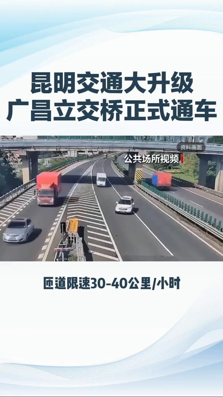 昆明交通大升级,广昌立交桥正式通车。 昆明交通大升级,广昌立交桥2月12日正式通车。这座连接昆明东部、南部的关键枢纽究竟会给出行带来哪些变化?根据昆明市住房和城乡建设局的通告,广昌立交桥于2月12日14时起正式开放通行。 这座立交桥位于昌宏路与广福路的交汇处,通车后昌宏路与广福路主线全程无信号灯,大大提高了通行效率。特别是广福路与昌宏路之间的交通转换将变得更加高效顺畅。不过试行期间也有临时交通管制措施,主路及辅路限速40公里/小时,匝道限速30-40公里/小时,出行时一定要注意安全。 此外立交桥地面层、辅道等配套设施还将进行分段施工,预计2026年上半年全面完成。虽然之前围挡施工给通行带来了一定影响,但现在通车了真是方便太多了。 广昌立交桥的通车无疑为昆明交通注入了新的活力,期待后续配套设施的完善让出行更加便捷。 大家对于广昌立交桥的通车有什么看法?快来评论区留言讨论。