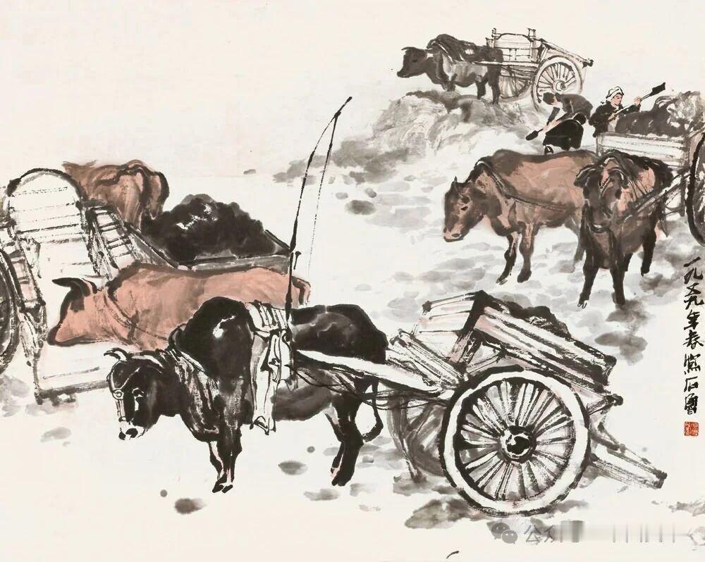 石鲁:画里藏着百姓的烟火气 石鲁的笔,总往百姓堆里扎。 他画陕北的老农,皱纹里夹着黄土,手里的锄头磨得发亮,裤脚沾着泥,眼神却像山丹丹花一样烈——那是他蹲在田埂上,看了无数个日出日落才刻进画里的;他画赶车的汉子,鞭子一扬,枣红马的鬃毛飞起来,车辙印在土路上歪歪扭扭,车斗里的南瓜滚得欢,连风里都飘着陕北的信天游。 他不画亭台楼阁的闲,专画柴米油盐的真。窑洞的窗棂糊着纸,炕上的棉被打了补丁,灶台上的铁锅冒着热气,连墙角的鸡窝都画得有模有样。笔墨里带着股生猛劲,线条像陕北的山梁一样硬,色彩像窗花一样艳,却艳得踏实,硬得亲切。 那些画里的人,会扛着锄头下地,会坐在门槛上抽烟,会抱着娃娃笑——没有刻意的姿态,全是日子本来的样子。石鲁把自己活成了他们的一份子,才把百姓的喜怒哀乐,都揉进了笔墨里。 看他的画,像走进陕北的窑洞,暖烘烘的,全是人间的热乎气。 石鲁 百姓画作 烟火气