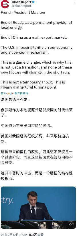 法国总统马克龙昨晚(北京时间2月11日晚)在欧洲工业峰会上的讲话:“俄罗斯作为本地能源长期供应国的时代结束了。中国作为主要出口市场的时代结束了。美国对欧洲经济征收关税,并采取胁迫机制。这将带来颠覆性的改变,因此这不仅仅是一个过渡阶段,而且这些新因素在短期内都不会改变。这并非暂时的冲击,而是一个明显的结构性转折点。” 俄罗斯作为欧洲本地能源长期供应国的时代走向终结,这一变化背后有明确的政策推动。欧盟已经通过法规,计划在2026年底前停止进口俄罗斯液化天然气,2027年9月底前终止管道天然气进口,即便设置了冬季供暖季等特殊情况的延期条款,也改变不了彻底脱钩的大方向。 2025年的数据显示,俄罗斯天然气在欧盟进口总量中的占比仍有13%左右,价值超过150亿欧元,但这一数字较危机前已大幅下滑,且欧洲正在通过挪威、卡塔尔、美国等多元渠道填补供应缺口,长期依赖关系的瓦解已成定局。 匈牙利、斯洛伐克等国虽有反对声音甚至提起诉讼,但无法扭转欧盟整体的战略转向,俄罗斯能源在欧洲市场的存在感只会持续弱化。 中国作为欧洲主要出口市场的时代落幕,本质上是全球贸易格局调整与欧洲战略转向共同作用的结果。 马克龙在此前的采访中就明确将中国定位为“越来越激烈的竞争对手”,欧洲工业正面临来自中国的强劲竞争压力,在清洁技术、制造业等领域的市场份额争夺日益激烈。 欧洲企业开始调整出口策略,不再将中国市场视为不可替代的核心目的地,转而寻求贸易伙伴多元化,这一转变并非短期战术调整,而是基于长期竞争力考量的战略选择。随着中国自身产业升级和内需市场扩大,欧洲产品在华市场的传统优势逐渐减弱,双方贸易关系的结构性变化进一步印证了马克龙的判断。 美国对欧洲经济征收关税并采取胁迫机制,正在直接冲击美欧传统盟友关系。2026年1月,美国已对欧盟钢铁、汽车零部件加征25%关税,涉及金额超300亿美元,马克龙明确警告这种关税威慑还可能蔓延到数字监管等领域。 更让欧洲警惕的是,在能源替代过程中,欧洲对美国液化天然气的倚重已经达到相当高的比例,2025年美国LNG占欧盟进口总量的58%,未来几年这一比例可能升至70%,这种能源依赖让美国的胁迫更具杀伤力。 美国通过贸易协定绑定欧洲能源采购,又以关税威胁干预欧洲内部政策,这种双重压力让欧洲深刻意识到依附美国的风险,也成为推动其寻求自主的重要动因。 这些变化共同构成了欧洲经济发展的新背景,其带来的颠覆性改变已经逐步显现。欧洲工业企业的能源成本较危机前大幅上升,2025年欧洲天然气价格仍接近危机前的3倍,企业利润空间被持续挤压。 为应对竞争与成本压力,马克龙呼吁欧盟简化内部市场监管、推行“欧洲优先”政策,甚至提出发行“未来欧元债券”筹集每年1.2万亿欧元的投资资金,用于国防、清洁技术、人工智能等关键领域。 但这些举措面临着欧盟内部的严重分歧,德国对“欧洲优先”的适用范围持保留态度,对共同举债更是长期拒绝,匈牙利等国在能源政策上与欧盟核心国家存在明显矛盾,内部共识的缺失让欧洲的转型之路充满挑战。 冯德莱恩、默茨等欧洲领导人都认同改革的紧迫性,比利时首相德韦弗更是直言“有人拿着手枪顶着欧洲的心脏”,这种普遍的危机感说明马克龙的判断得到了欧洲政坛的广泛呼应。 结构性转折点的到来,意味着欧洲必须彻底调整过去的发展模式,在能源自主、贸易布局、内部治理等方面做出根本性变革。 这些新因素不会在短期内逆转,欧盟需要在外部压力与内部分歧之间寻找平衡,通过强化内部协调、加大战略投资、拓展多元合作,才能在新的全球格局中站稳脚跟。 马克龙的讲话本质上是对欧洲的一次警醒,推动欧洲在动荡的国际环境中加速寻求真正的战略自主,这一进程虽充满不确定性,但已成为不可逆转的趋势。