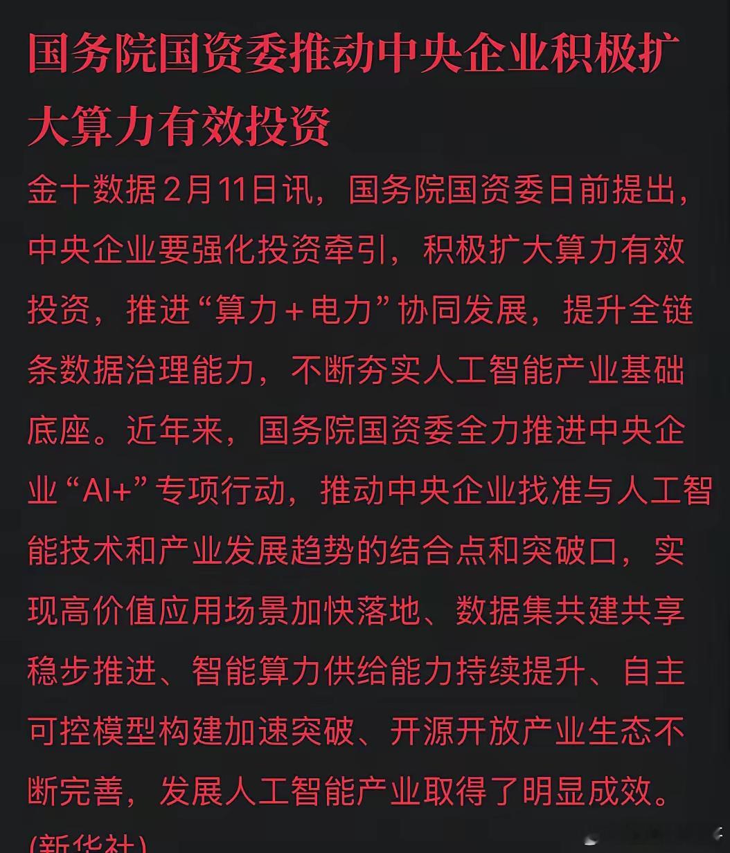 国家深夜发令!万亿算力产业被引爆,国家押注的方向,从来不会错!2月11日,国务院国资委突然出手:中央企业必须强化投资牵引,大规模扩大算力有效投资!更首次提出——算力+电力协同发展。这不是普通政策,而是中国AI产业的总攻号角!这意味着,未来几年,央企将带头砸下万亿级真金白银,建设国产智算中心、高速数据网络和绿色能源配套;东数西算全面提速,西部风电、光伏直接为AI服务器供电;全链条数据治理升级,让大模型训练更安全、更高效、更自主。背后信号极其明确,国家要把AI基础底座牢牢掌握在自己手中,华为昇腾、寒武*、中科**等国产算力链迎史诗级订单,自动驾驶、智能制造、金融AI等场景将获得“国家队”算力支撑。风口来了,你准备好了吗?