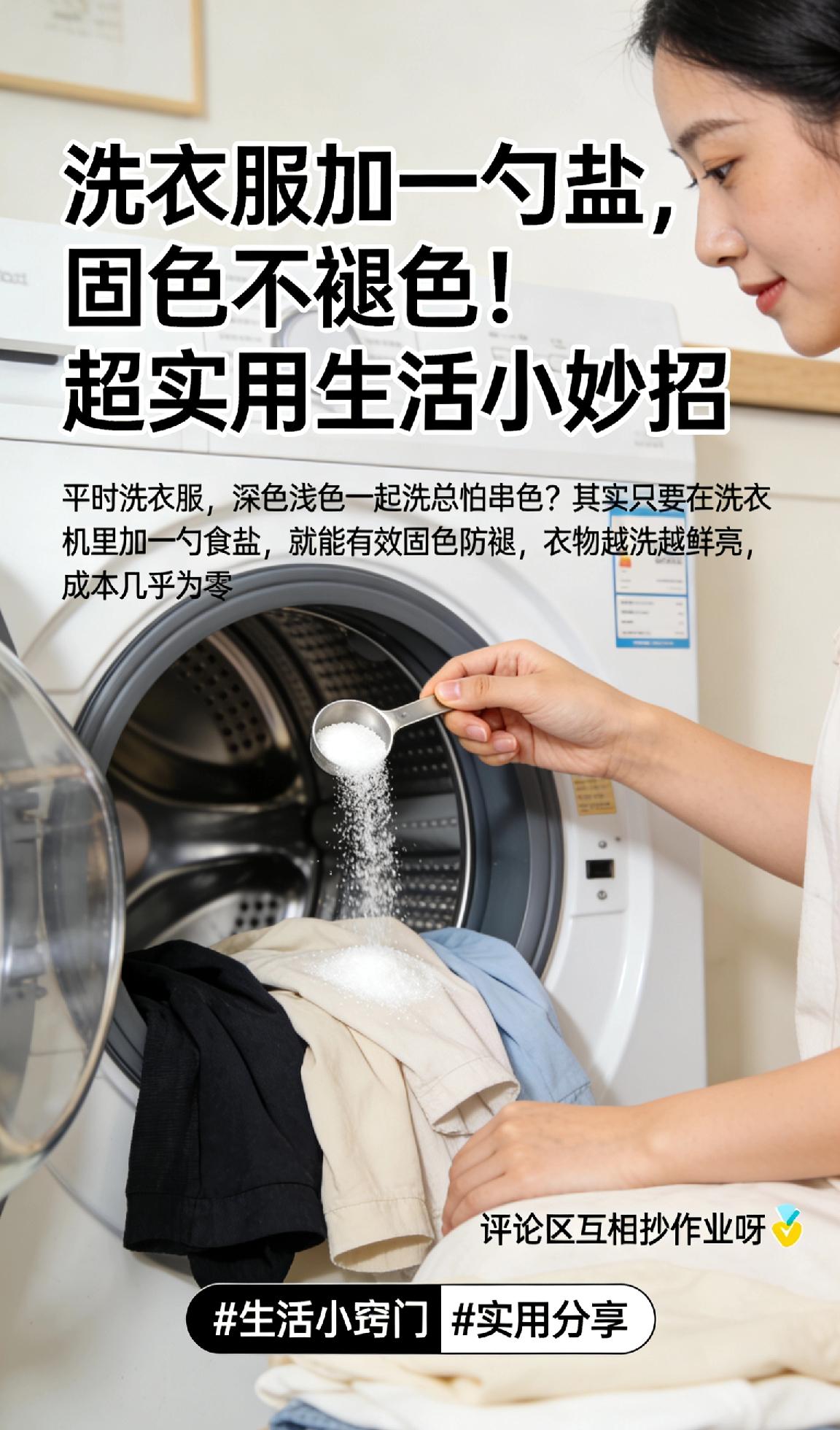 洗衣服加一勺盐,固色不褪色!超实用生活小妙招 平时洗衣服,深色浅色一起洗总怕串色?其实只要在洗衣机里加一勺食盐,就能有效固色防褪,衣物越洗越鲜亮,成本几乎为零。过日子嘛,这些小方法攒多了,真的能省不少心。 你们还有哪些压箱底的生活妙招?评论区互相抄作业呀👇 生活小窍门
