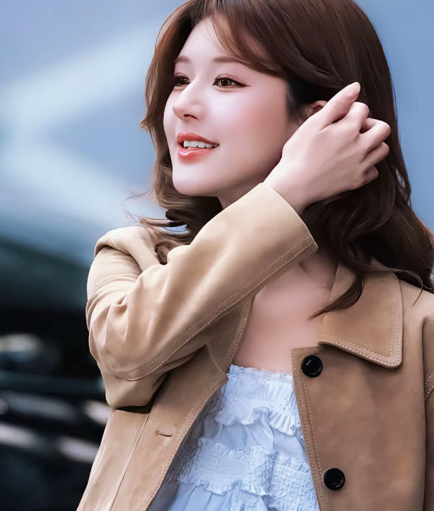 浅棕色麂皮外套,叠穿白色蕾丝吊带,一头慵懒的羊毛卷