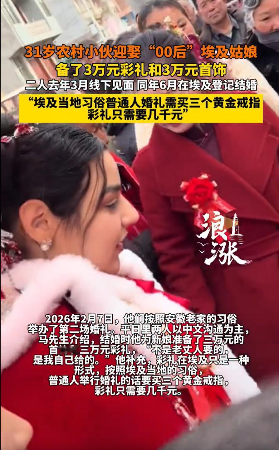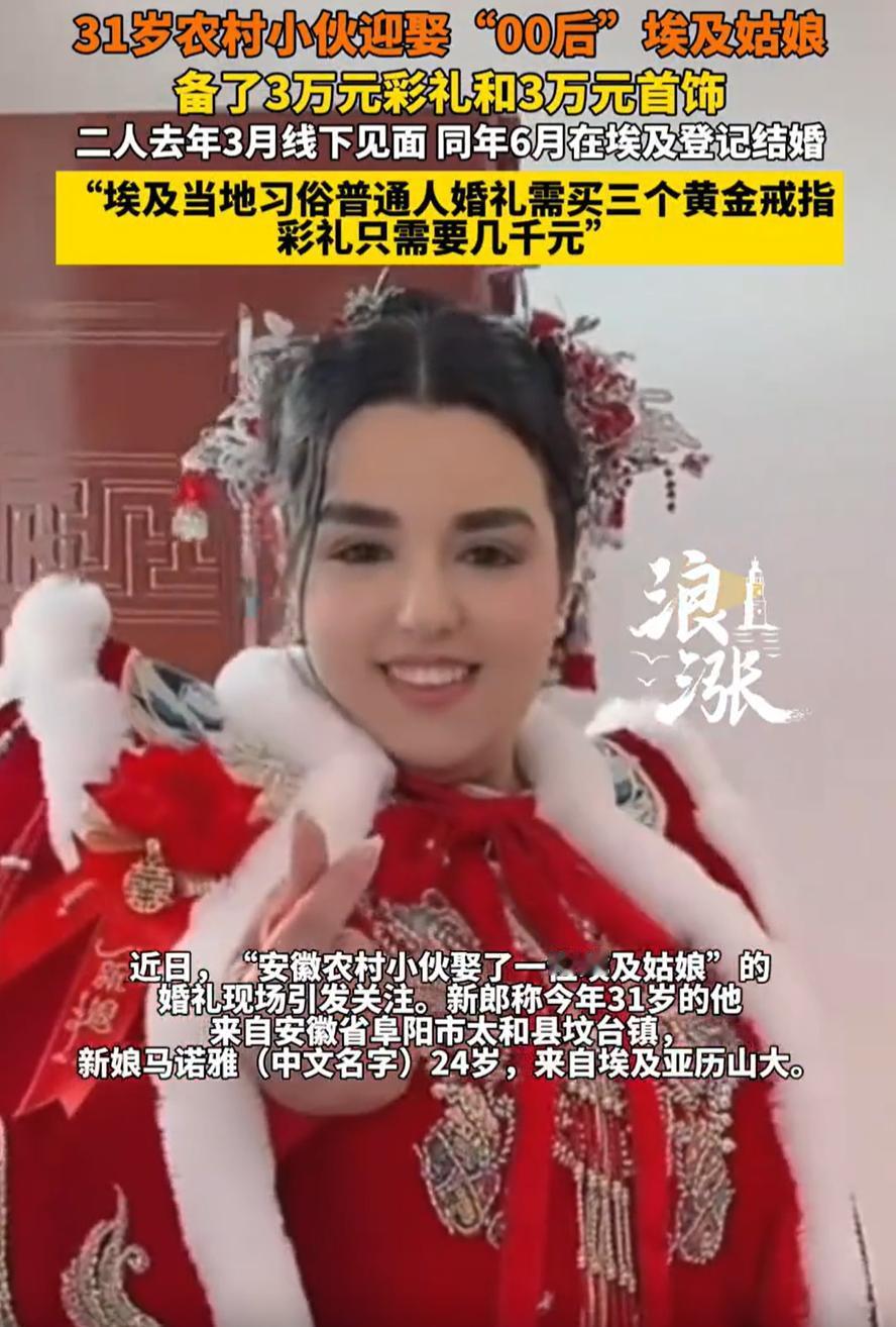 安徽阜阳,一名31岁农村小伙火了,不是他长得多帅多有钱,而是他娶了一名埃及的媳妇,两人相识之初甚至都没有交换过照片,在线下见面后很快就结了婚,而在婚礼当天,他还主动备了3万元彩礼和3万元首饰 起初,村里人本来以为是旅游带回来的外国朋友,结果一打听,是真领证,真办席,真过日子。更让亲戚们意外的是,婚礼当天,马先生掏了三万块彩礼,又买了三万多块钱的首饰,直接交到新娘子手里 有长辈打趣说,外国姑娘也兴这个?马先生笑了笑,说,不是老丈人要的,是我自己愿意给 这事说起来也挺有意思。马先生常年在埃及跑市场,去年年初,他在网上查资料的时候,偶然刷到一个埃及女孩的帖子。女孩叫马诺雅,正在自学中文,还兼职教中国人阿拉伯语。马先生也没多想,就主动打了声招呼 两个人就这样聊起来了 没发照片,没开视频,纯粹靠打字交流。一个教语言,一个问市场,慢慢聊到了各自的家里、小时候的事、对未来的想法。马先生说,那时候就觉得这姑娘跟别人不太一样,踏实,也有主意 2025年3月,马先生正好要去埃及出差,两人约了见一面。说来也怪,之前谁也没看过谁长什么样,见面也没有尴尬,像认识了很久的老朋友。马诺雅说,她第一眼就觉得这个人可以相信 后面的事快得像按了快进键。5月订婚,6月在埃及登记结婚,7月就在那边办了一场简单的婚礼。马诺雅的家人没有提任何彩礼要求,按当地风俗,普通人家结婚买三个金戒指,再出个几千块钱意思一下就行了 但马先生没按这个标准来 他私下准备了3万块钱的彩礼,又挑了价值3万多的金首饰,在埃及那场婚礼上交给了新娘。他后来跟朋友说,人家姑娘大老远嫁过来,语言、饮食、气候都要重新适应,这不是钱的事,是一份心意 对于这个跨国婚姻,有网友调侃说,马先生以后就是“法老王”了,这种幽默的话语带出了人们对这段婚姻的好奇,也让我们看到一些轻松的互动 不过,归根结底,马先生和马诺雅的故事让我们想明白一点:爱情,真的是可以超越国界和传统的界限,关键在于彼此的心意和选择