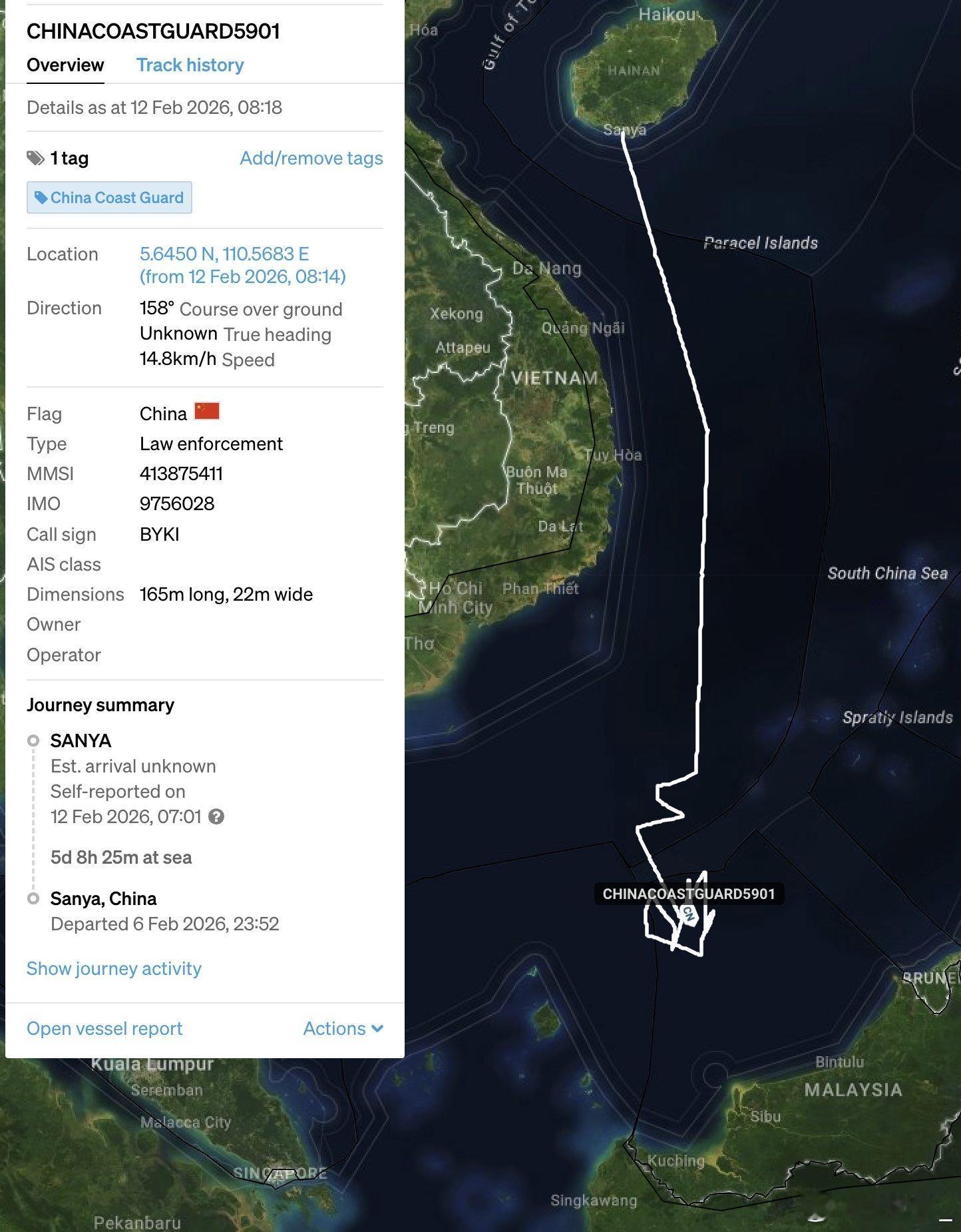中国海警5901舰本月7日再次出航,今天抵达南海西南海域开始巡航。南海态势