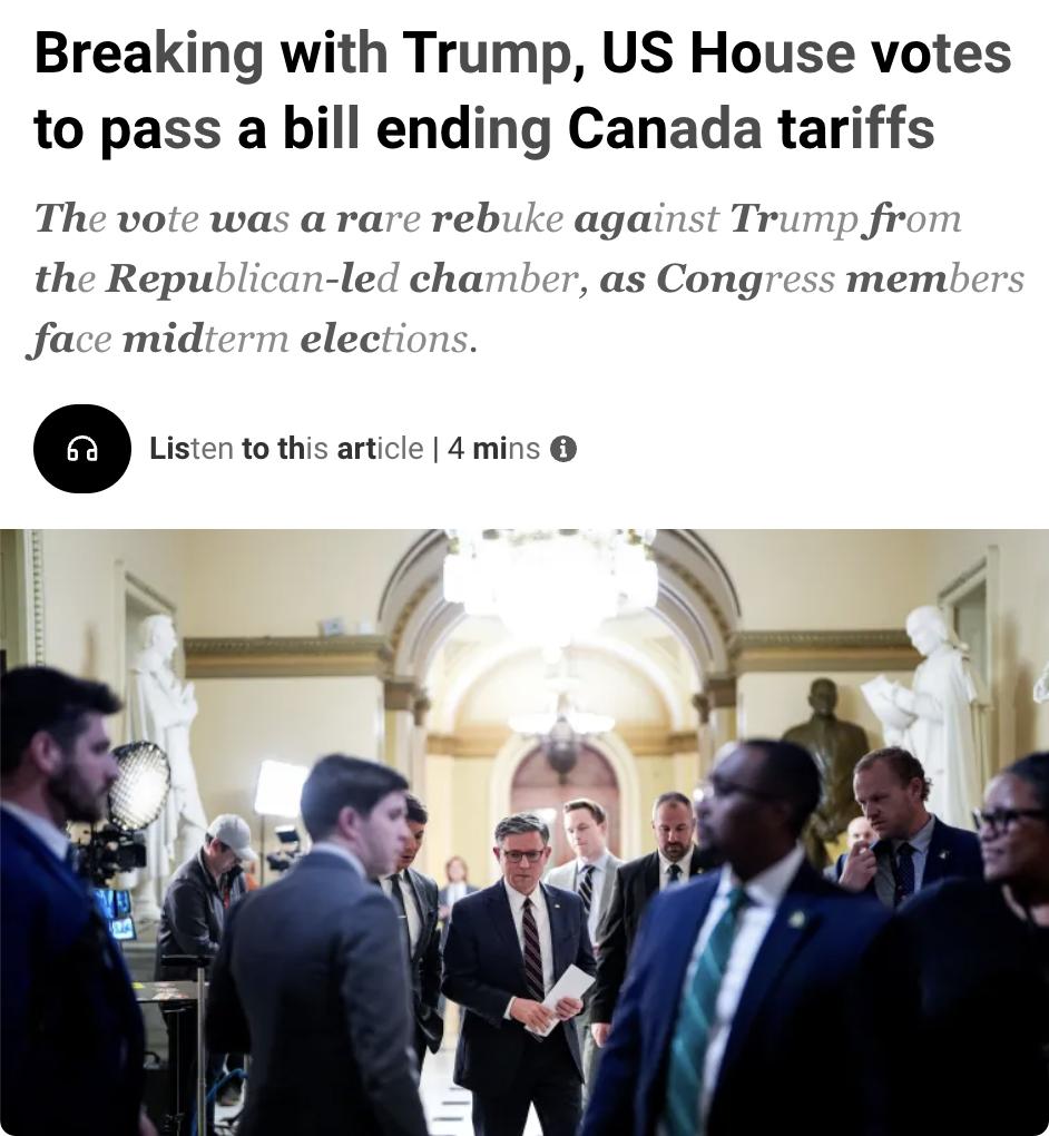 外媒:美国众议院通过一项法案,旨在取消特朗普对加拿大的关税。这一投票被视为共和党内部对特朗普的罕见反对,尤其是在中期选举临近之际。 投票结果显示,219票支持取消关税,211票反对。尽管共和党在众议院拥有218个席位的多数优势,但仍有部分共和党议员跨越党派界限与民主党共同投票。特朗普此前威胁称,任何投票支持该法案的共和党人将在选举中面临严重后果。 尽管众议院通过了法案,但预计特朗普会否决,且国会难以获得推翻否决所需的三分之二多数票。不过,民调显示特朗普的关税政策并不受欢迎,60%的受访者表示反对。