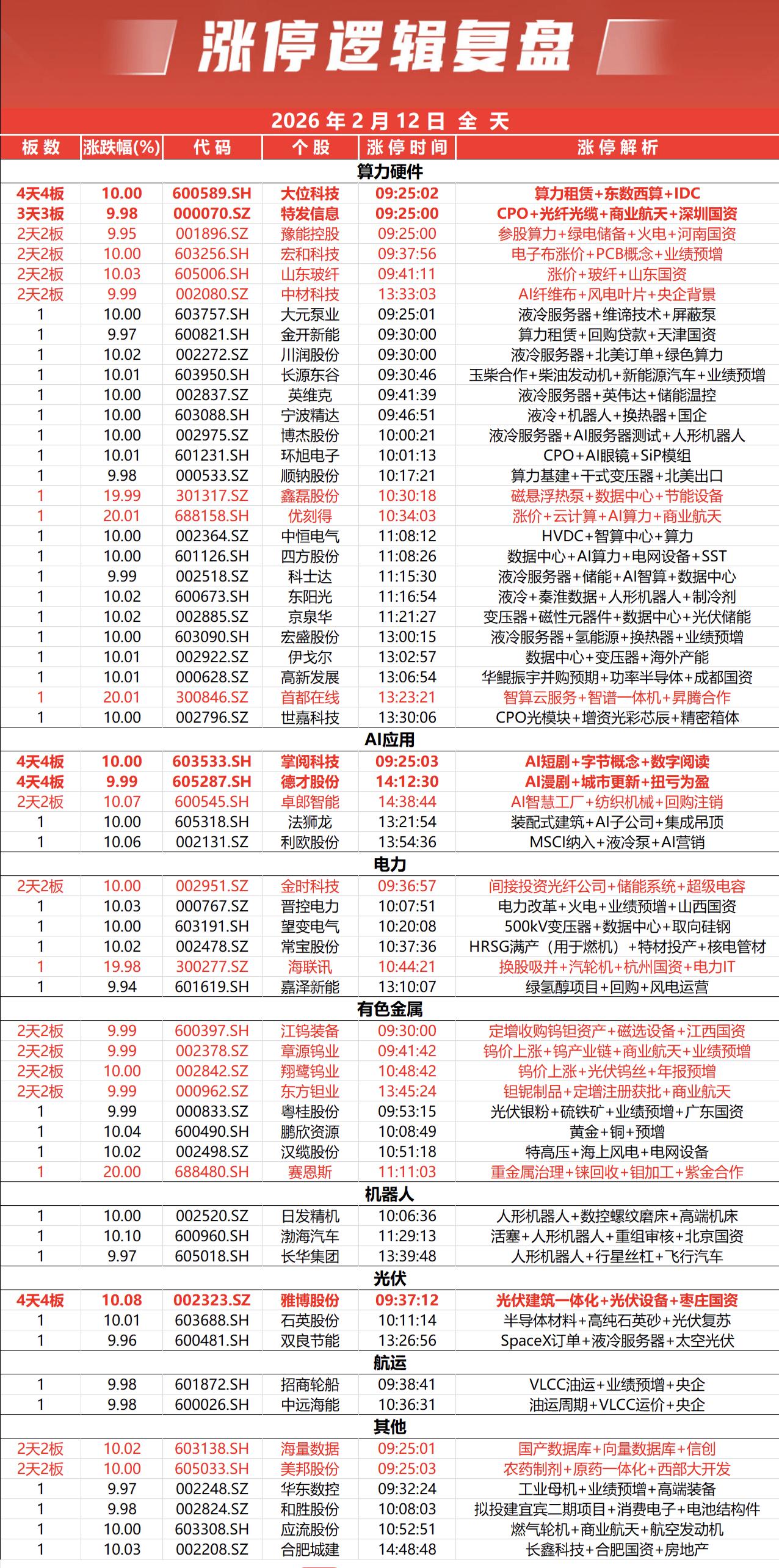 2月12日上午连板梯队梳理AI概念股领涨,光伏、算力、钨业多板块爆发,连板股