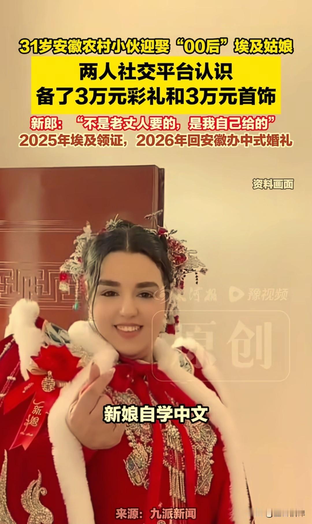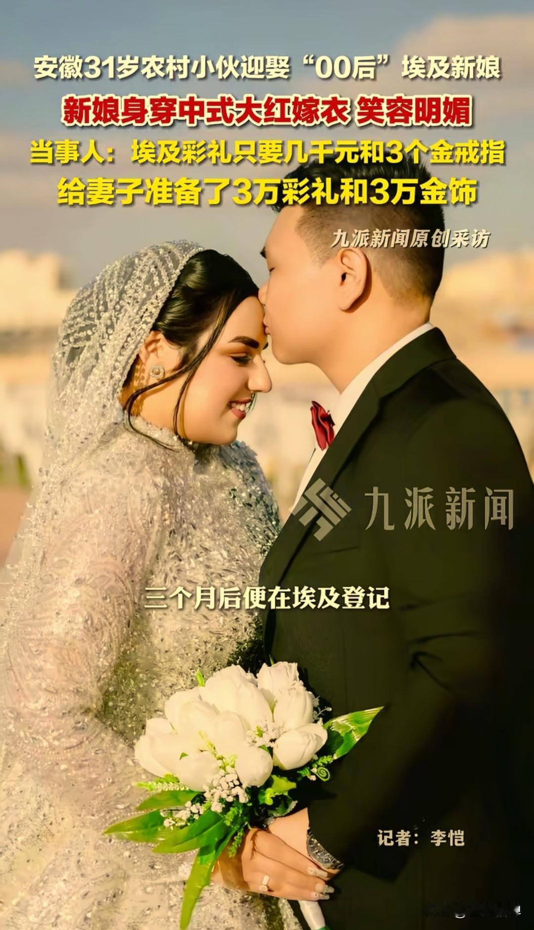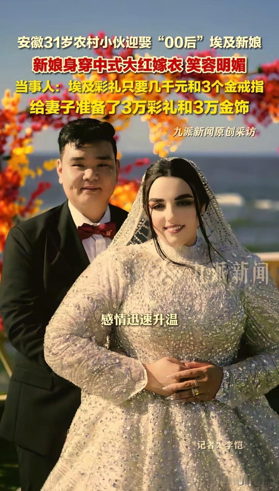 安徽小伙娶“00后”埃及新娘:3万彩礼主动给,中式嫁衣惊艳全村 近日,安徽阜阳太和县坟台镇一场特殊婚礼刷屏网络:31岁农村小伙马先生,迎娶了24岁“00后”埃及新娘马诺雅(中文名)。这是村里第一位“洋媳妇”,婚礼当天比过年还热闹,新娘身着大红中式嫁衣,笑容明媚,成了全场最亮眼的风景。 这段缘分像极了“盲盒式恋爱”。去年马先生原本计划去埃及闯荡,在社交平台搜集信息时,刷到了正在自学中文、同时教中国人阿拉伯语的马诺雅。他跟着姑娘学了一个月阿语,两人从互相学习语言开始,慢慢聊到生活、理想,感情在屏幕两端迅速升温。现在回想起来,马先生自己都觉得不可思议:“没见过面就定了终身,现在想想真的很奇妙。” 2025年3月,马先生赴埃及考察市场,两人终于线下见面。尽管此前从未交换过照片,见面后却像认识了很久的老友。三个月后便在埃及登记结婚,7月举办了当地婚礼;2026年2月7日,又回到安徽老家,按当地习俗补办了一场热闹的中式典礼。视频里新娘穿红色礼服笑得特别甜,赶集时全村人都认得她。 洋媳妇来了也适应得挺好,婚后一个月就能用中文简单唠嗑,胃口也从不喜欢吃菜变成疯狂爱上豆腐、豆芽、蘑菇和烧烤,正琢磨着学习做中国菜。 谈及彩礼,马先生表示挺让人意外的,他说:“不是老丈人要的,是我自己给的。”按照埃及当地习俗,普通人结婚就有个形式,只需准备3个金戒指和几千元彩礼就够了,更多是仪式感。但马先生主动准备了3万元彩礼+3万元金饰,他说:“这是我对她的心意,也是对这段婚姻的重视,既要尊重埃及的习俗,也不能委屈了她,更要对得起咱们安徽的礼数。” 关于未来生活打算:小两口准备四月份就回埃及,打算从旅游餐饮做起,顺便拍短视频记录跨国生活。 这场跨国婚姻,没有天价彩礼,没有复杂套路,只有两个年轻人在语言课上萌生的真心,和跨越山海的勇气。正如马先生所说:“爱情不分国界,真心才是最好的聘礼。” 新中式订婚照 00后婚礼 埃及媳妇 埃及婚礼习俗 外国零彩礼