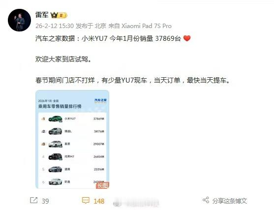 【1月小米YU7销量全国第一】小米YU7首次单月全国销量榜首 据雷军发布的汽车之家数据,小米YU7今年1月份销量37869台,首次夺得中国市场乘用车销量总冠军。